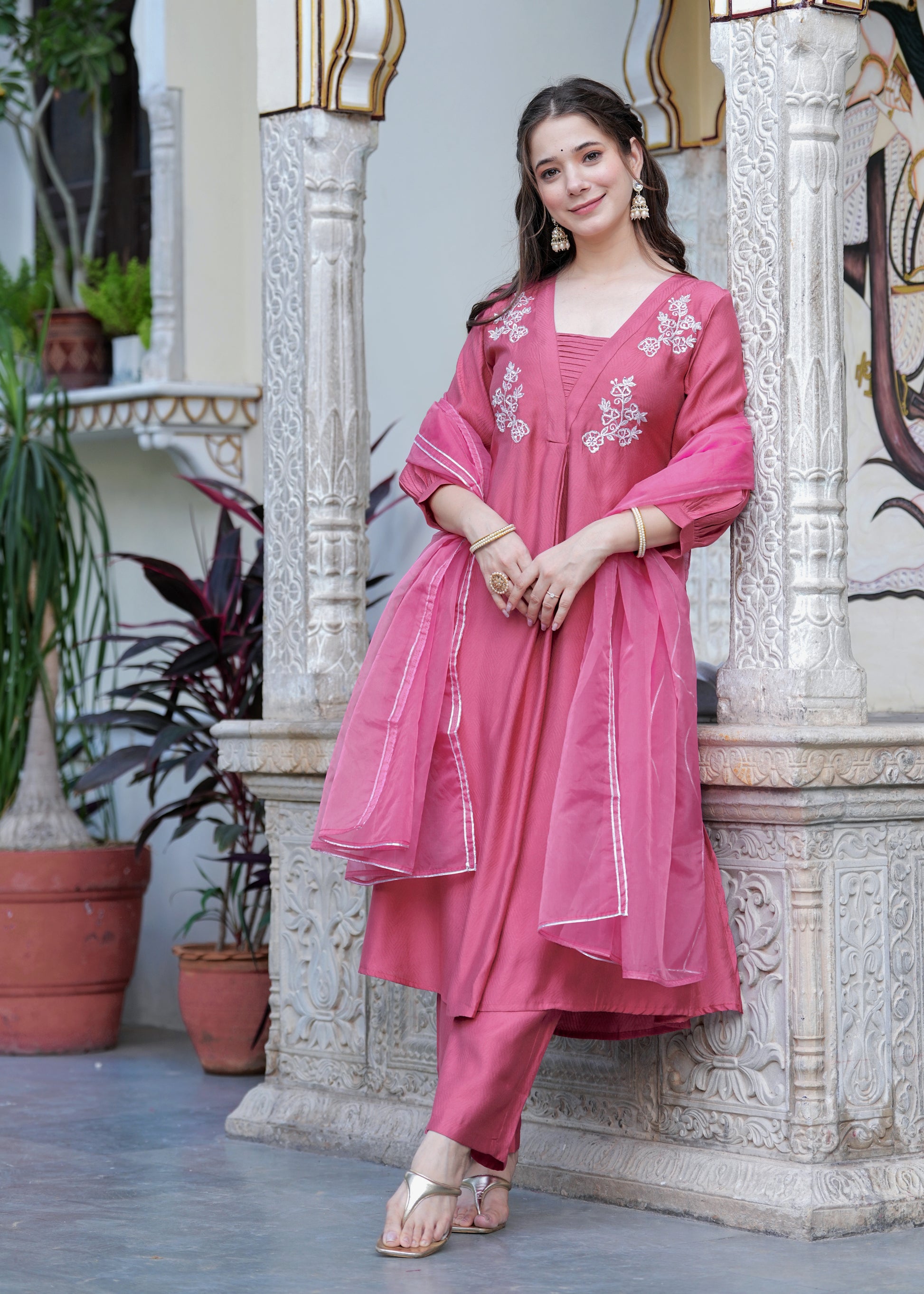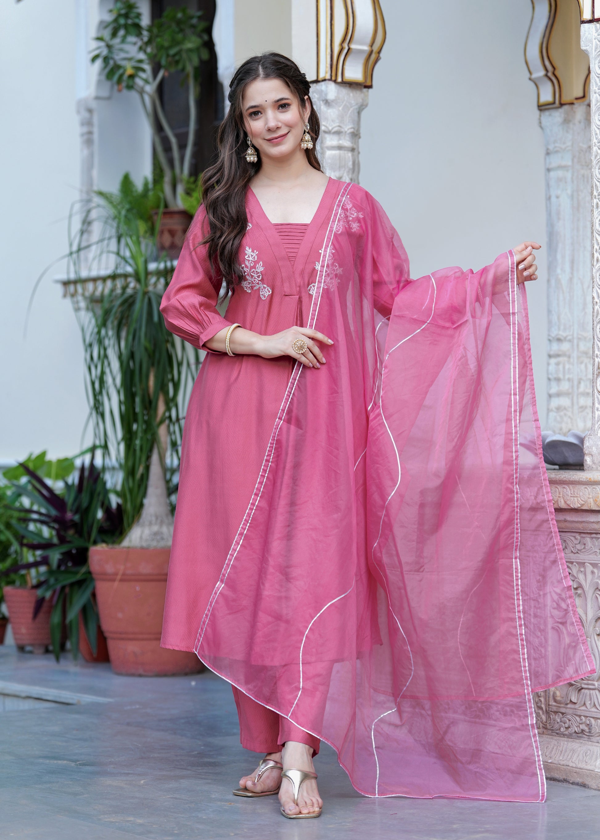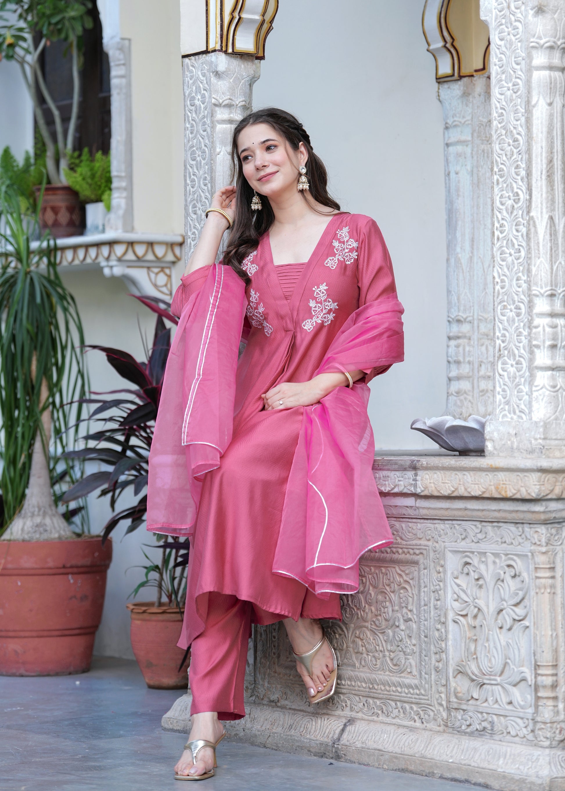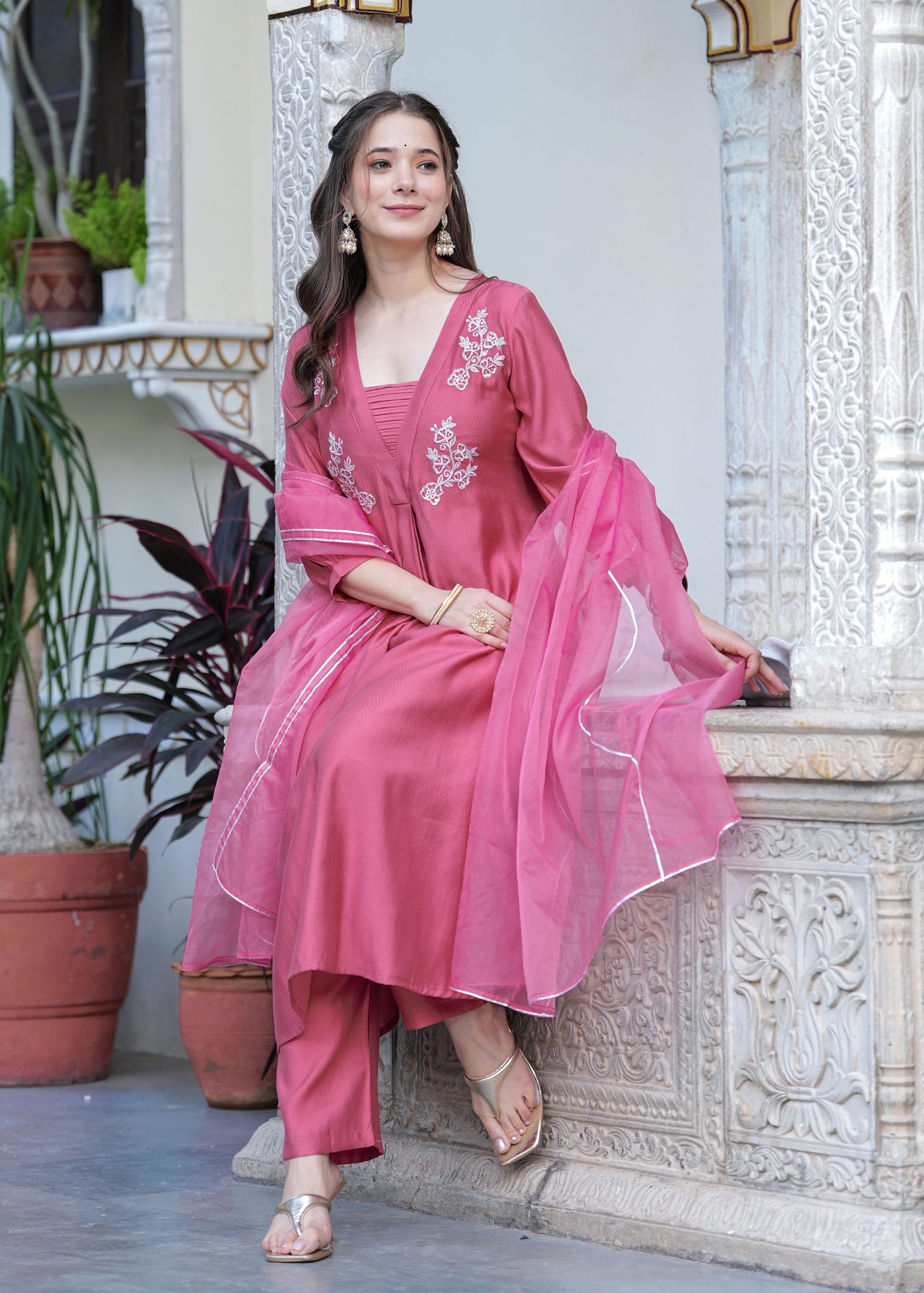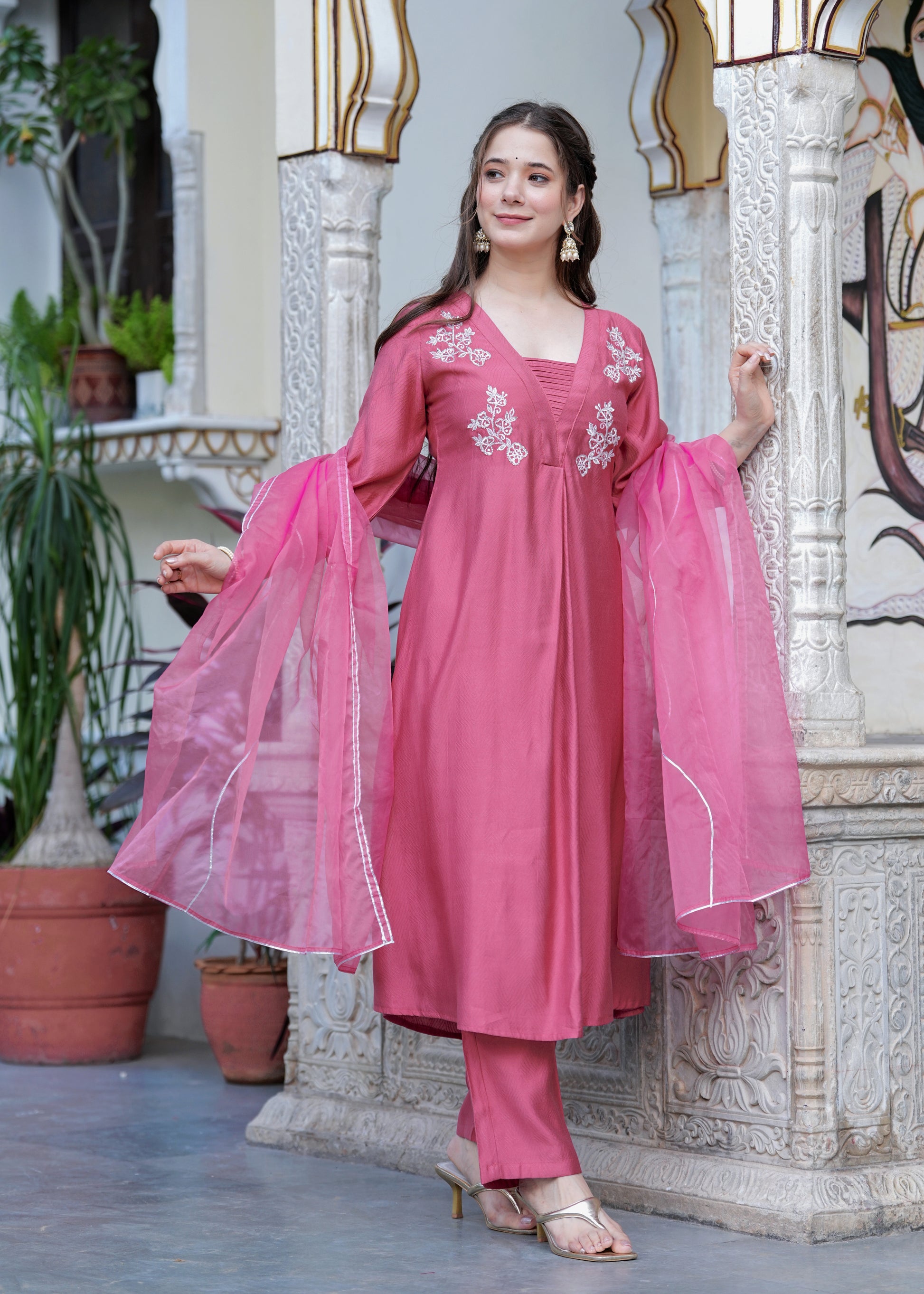 Grace meets elegance in this stunning rose pink suit set, designed for the modern woman who values tradition with a contemporary twist. The flared kurta features intricate white floral embroidery on the yoke, paired with a finely ruched neckline for added charm. Crafted from soft, flowy fabric, the set includes straight-fit pants and a matching organza dupatta with delicate lace on the border. Perfect for festive gatherings, daytime functions, or elegant evenings, this ensemble is a timeless wardrobe essentials.