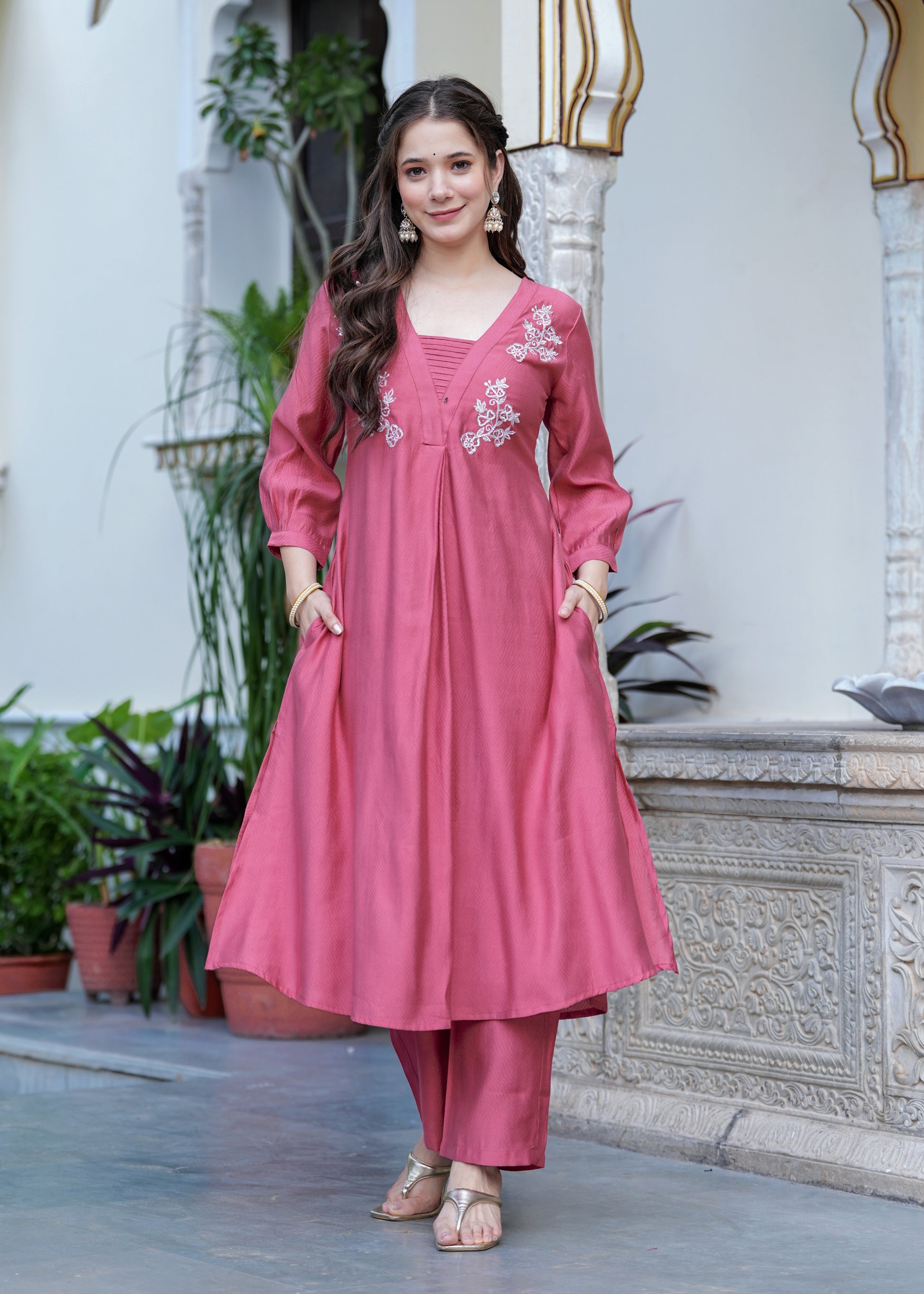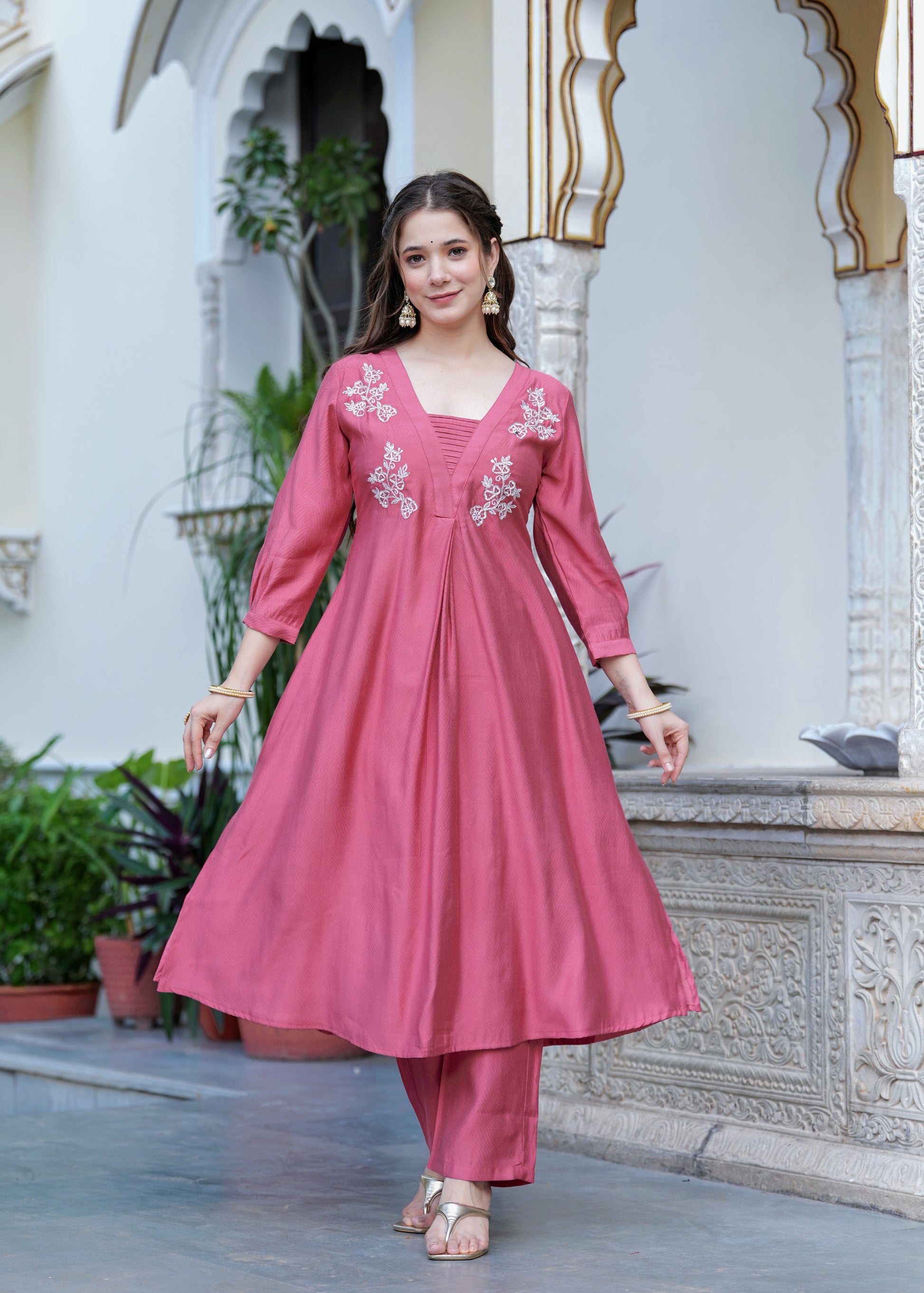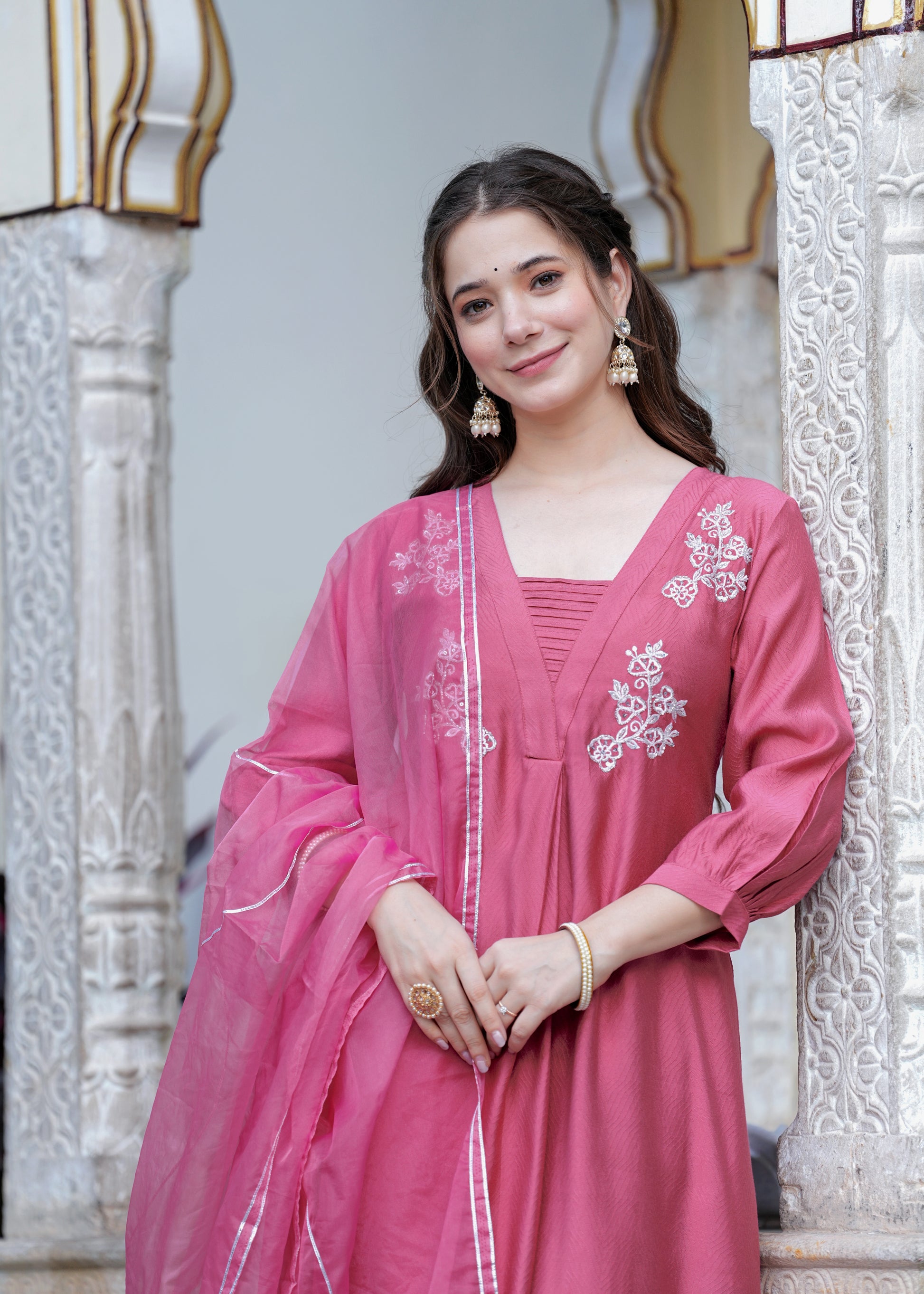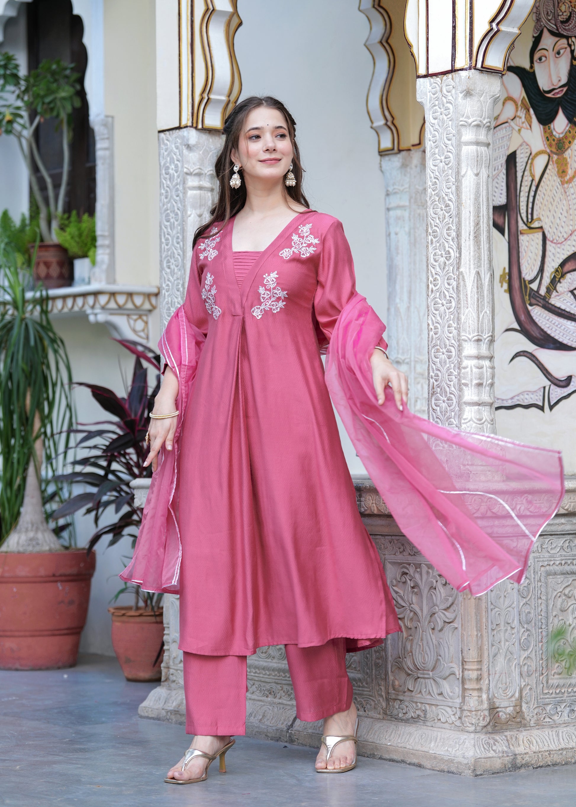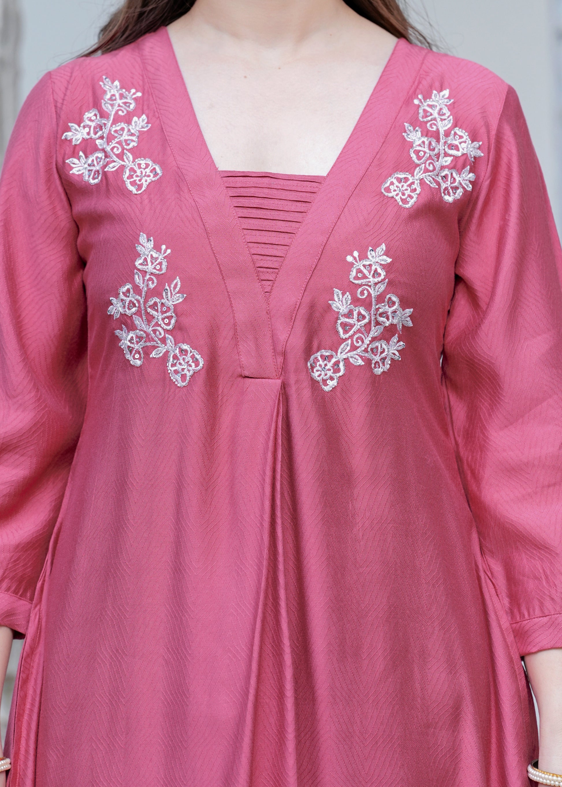 Grace meets elegance in this stunning rose pink suit set, designed for the modern woman who values tradition with a contemporary twist. The flared kurta features intricate white floral embroidery on the yoke, paired with a finely ruched neckline for added charm. Crafted from soft, flowy fabric, the set includes straight-fit pants and a matching organza dupatta with delicate lace on the border. Perfect for festive gatherings, daytime functions, or elegant evenings, this ensemble is a timeless wardrobe essentials.