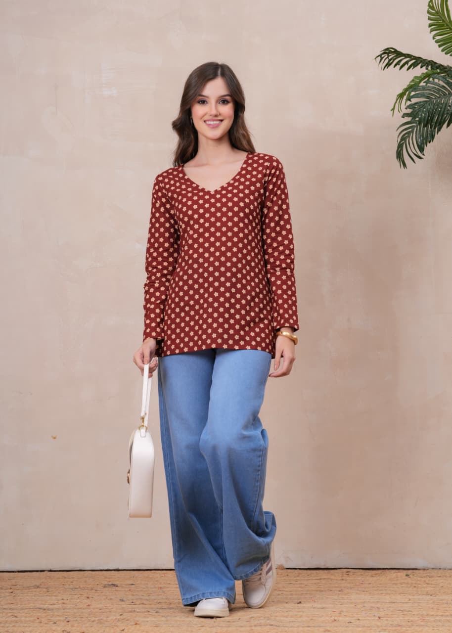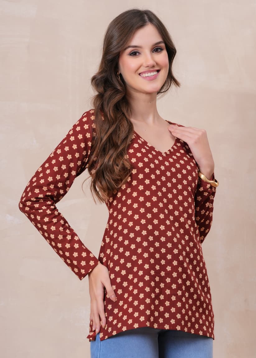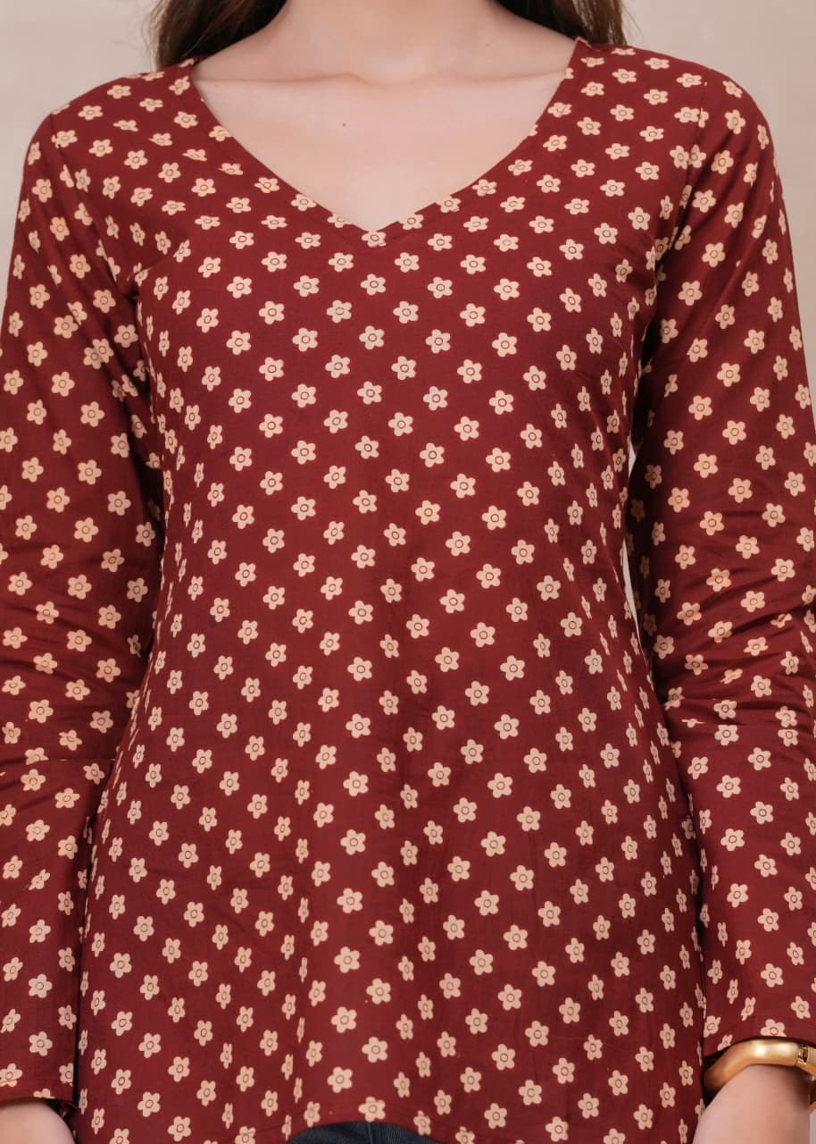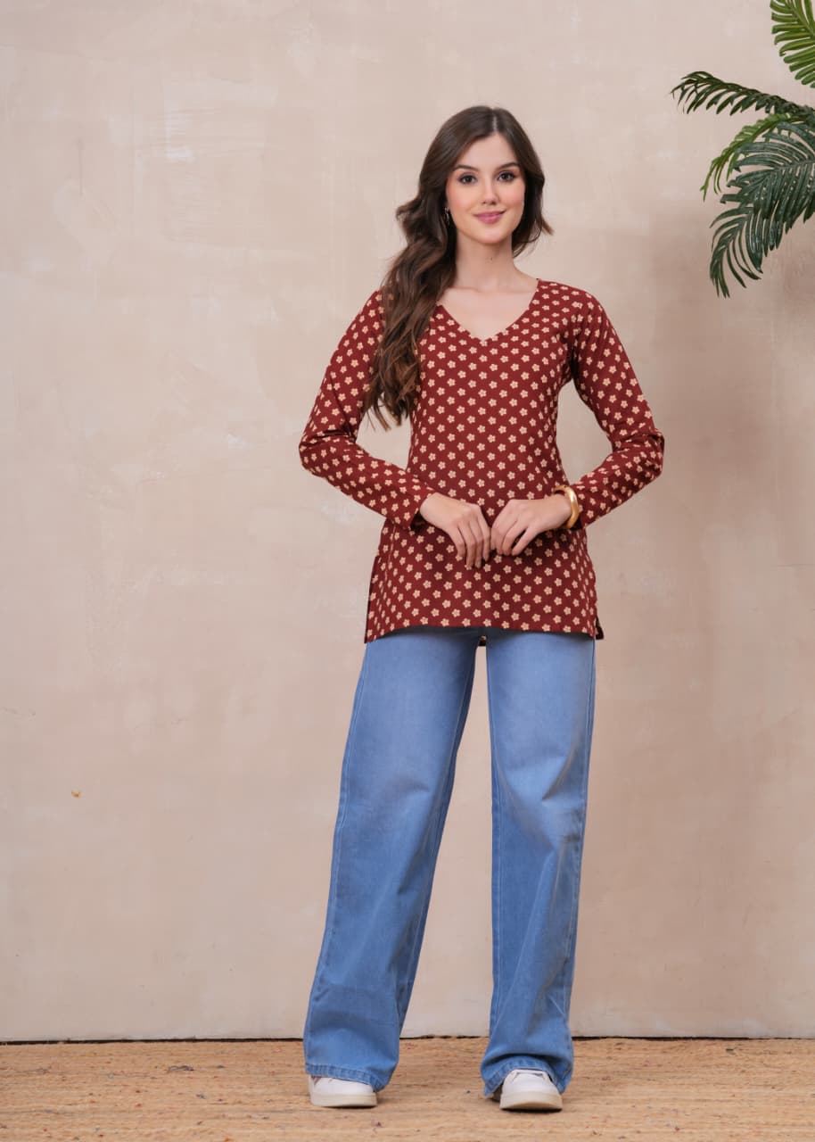 Add a touch of elegance to your everyday wardrobe with our Rust Blossom Cotton Kurti, crafted in a deep rust base adorned with delicate beige floral motifs. Featuring a flattering V-neckline, full sleeves, and a straight cut with side slits, this kurti offers the perfect blend of comfort and elegance. Pair it with jeans, trousers, or palazzos for a versatile look that transitions effortlessly from casual outings to workwear. Made from breathable cotton, it ensures all-day ease while keeping your style effortlessly chic.
