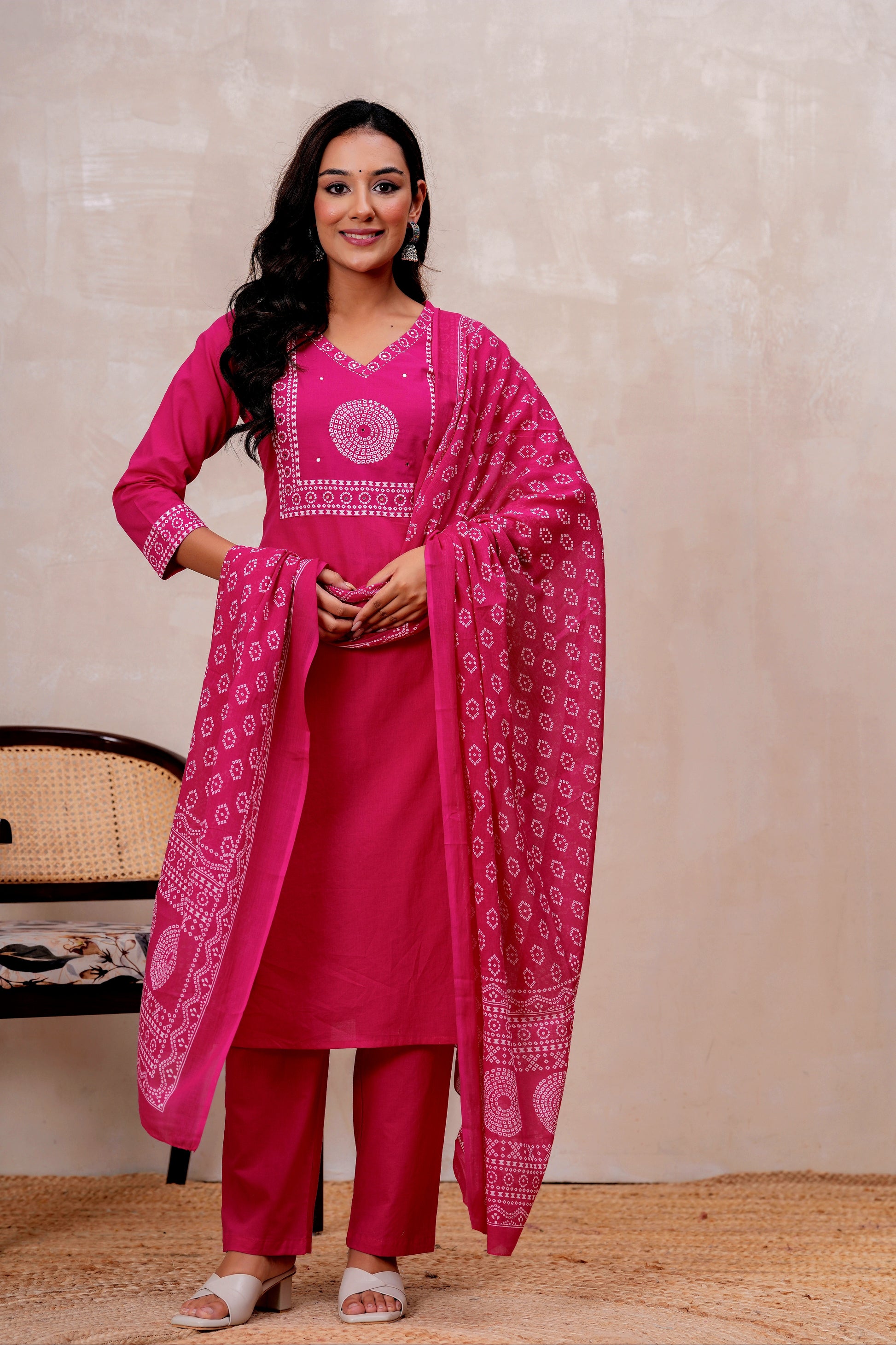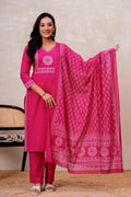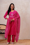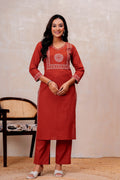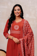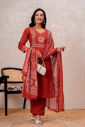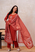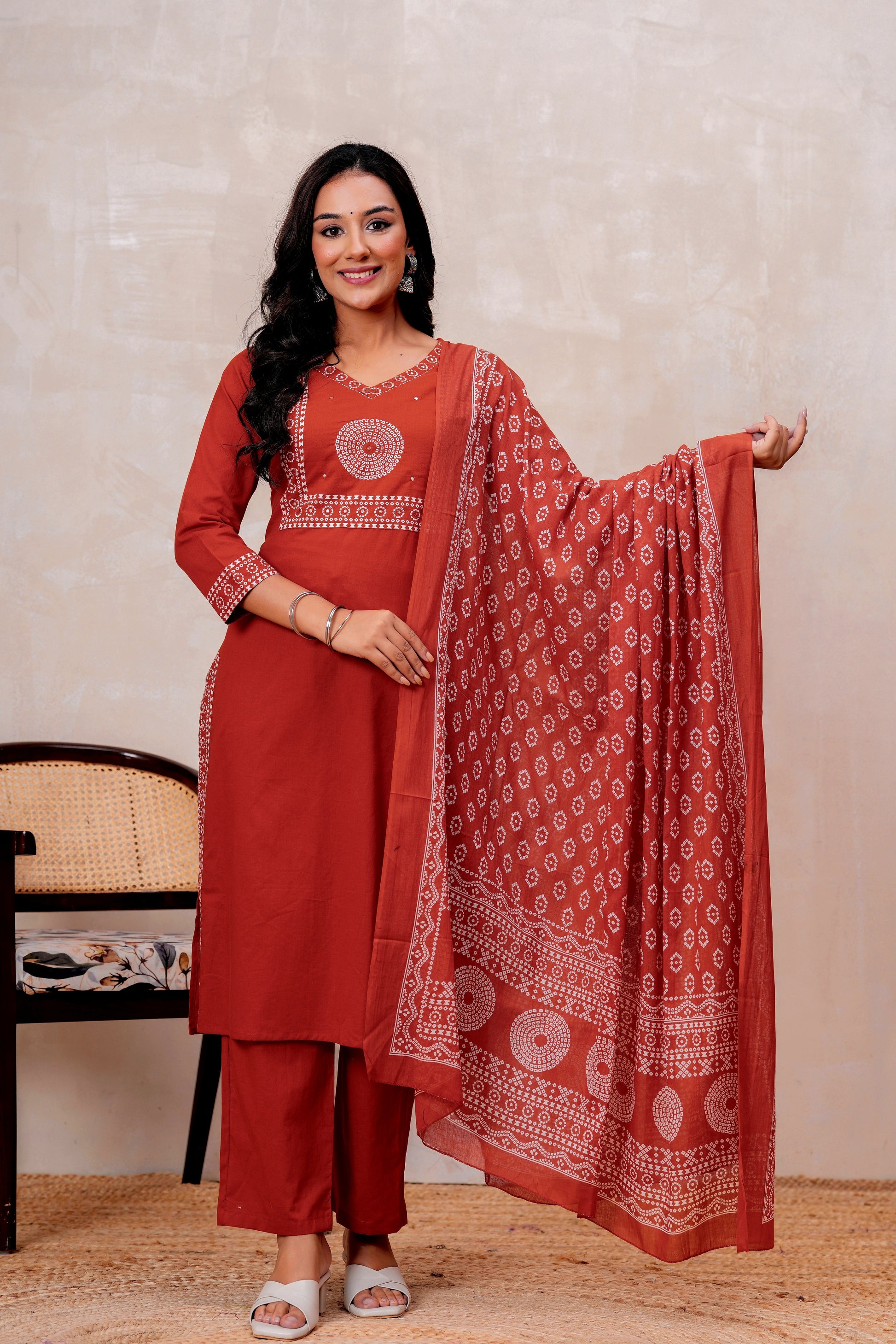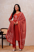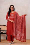 Elevate your ethnic style with this elegant Rust orange Handblock Printed Cotton Suit Set. The straight-fit kurta features intricate white prints on the yoke and sleeves, paired with solid rust cotton pants for all-day comfort. A beautifully printed dupatta adds a graceful touch to the look. Perfect for festive gatherings or everyday elegance.
