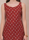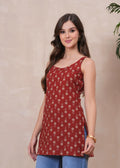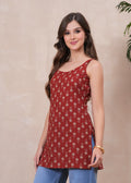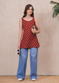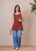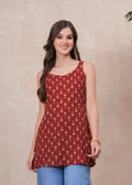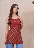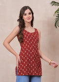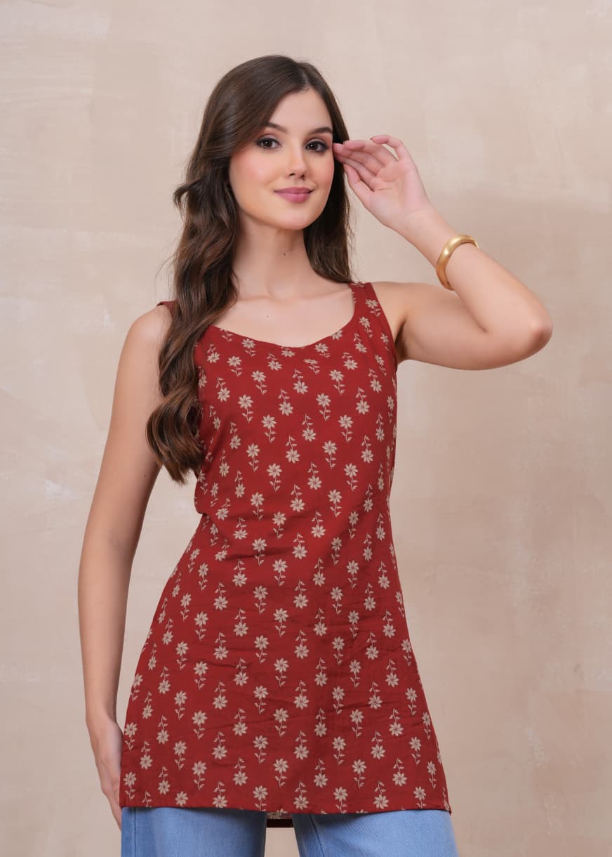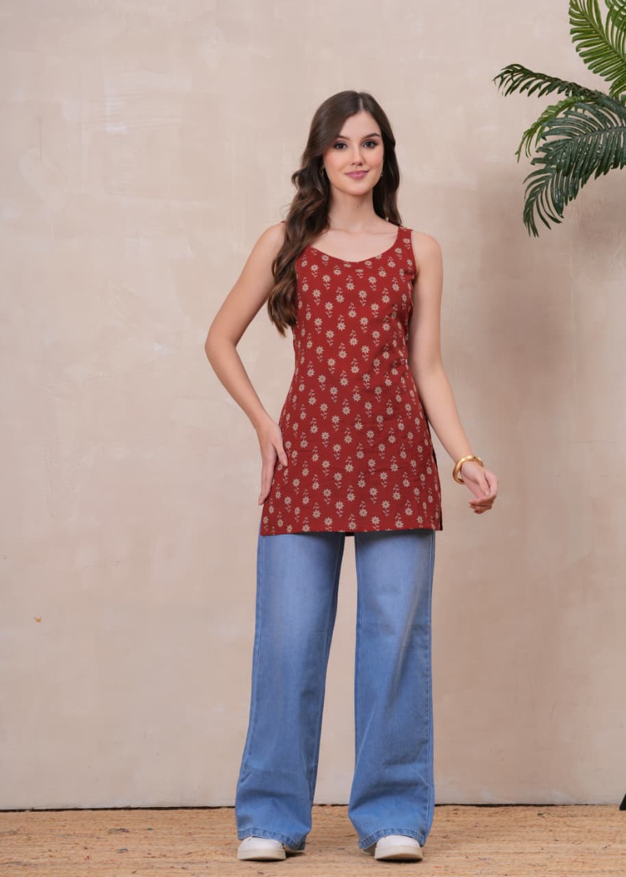 Style up your everyday style with this chic sleeveless short kurti, featuring an elegant rust orange floral block print. Crafted from soft, breathable fabric, it offers all-day comfort with a modern, easy-to-wear silhouette. The side slits add a touch of flair, making it perfect to pair with palazzos, jeans, or straight pants. Ideal for casual outings, workwear, or relaxed looks.