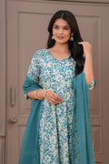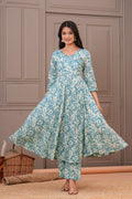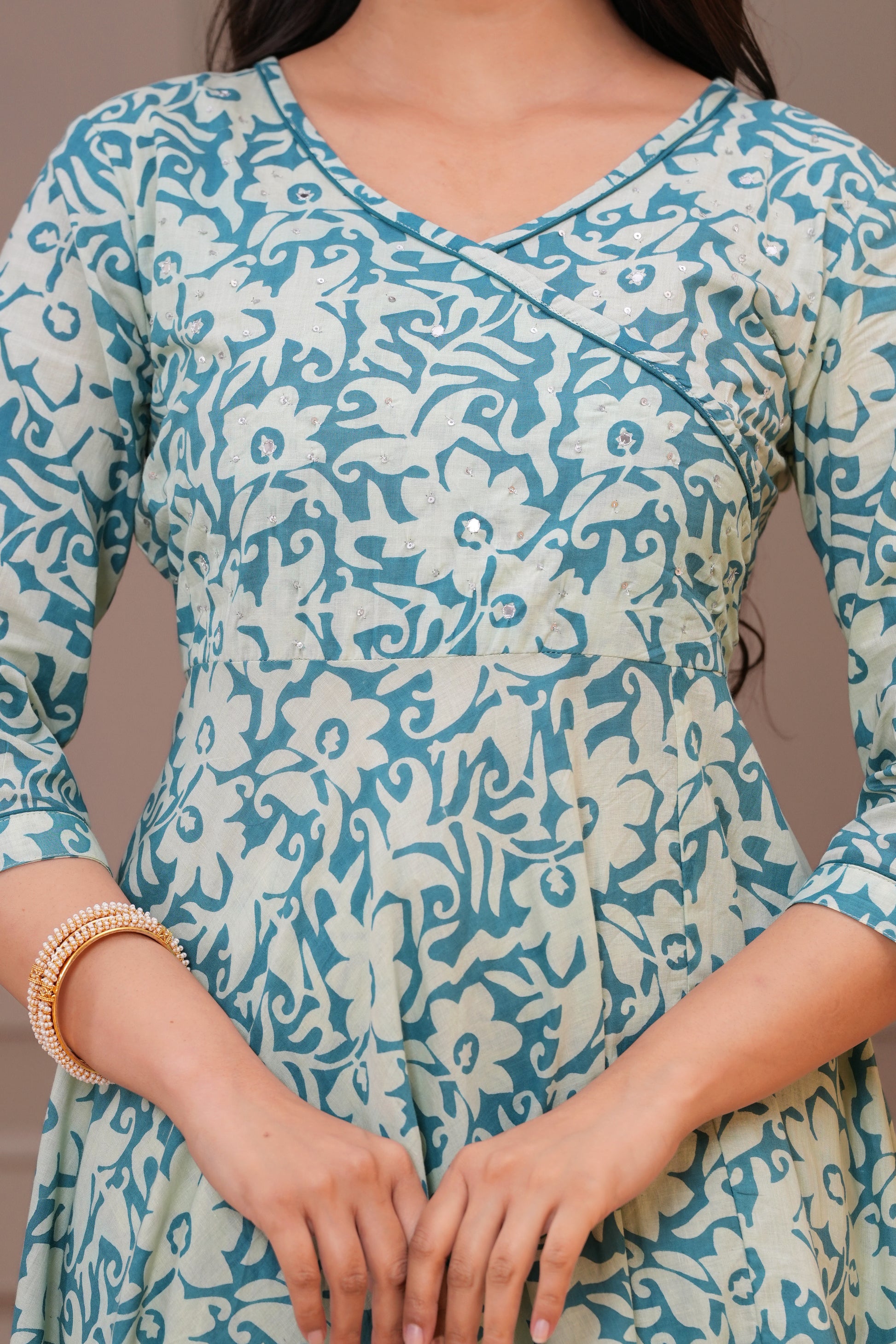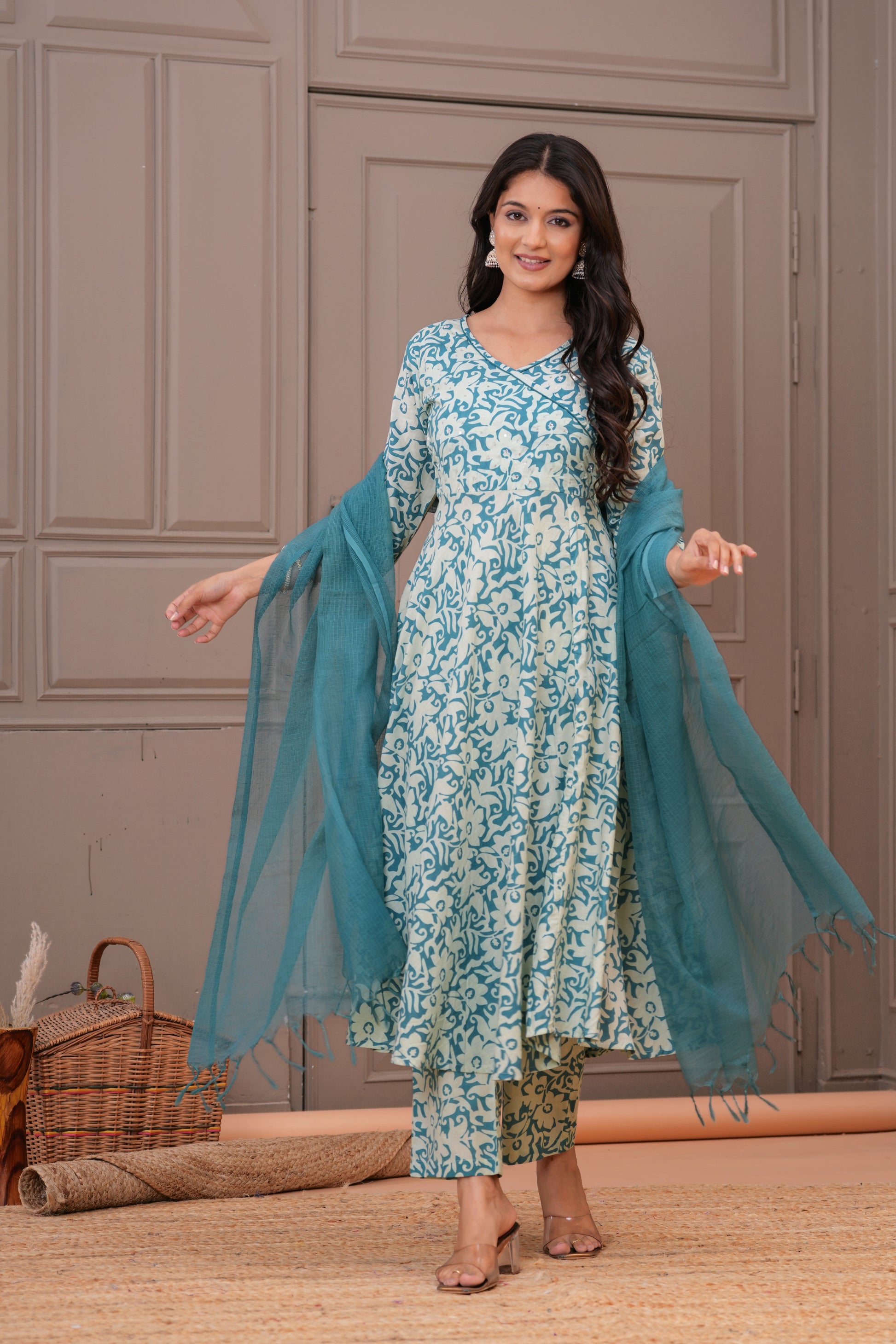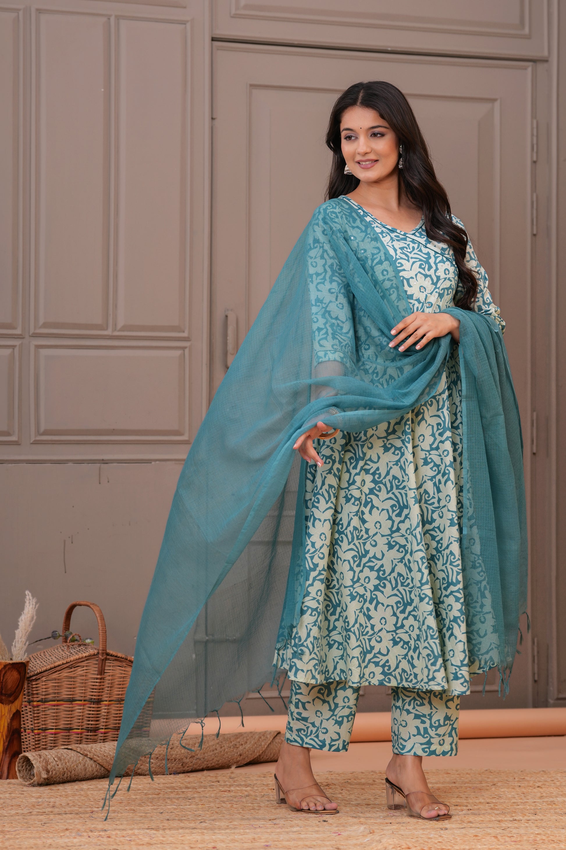 Embrace elegance with our soothing sea green Anarkali suit set, crafted in soft cotton for all-day comfort. Featuring an intricate floral block print, this flowy Anarkali is paired with matching straight pants and a lightweight dupatta that adds a graceful finish. Perfect for festive days, casual outings, or brunch with friends — this look blends tradition with effortless charm.