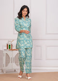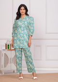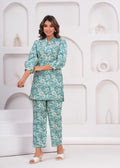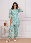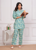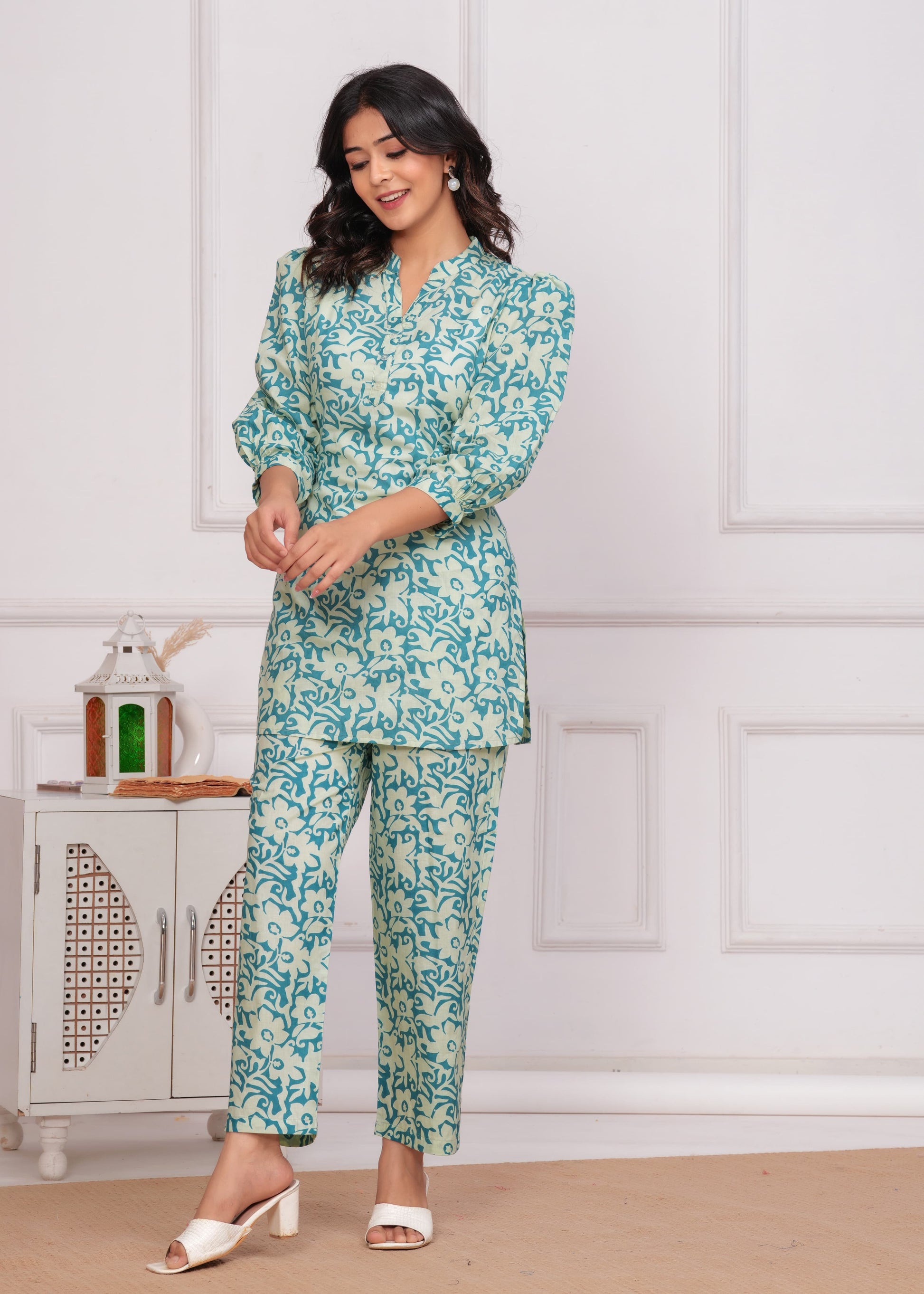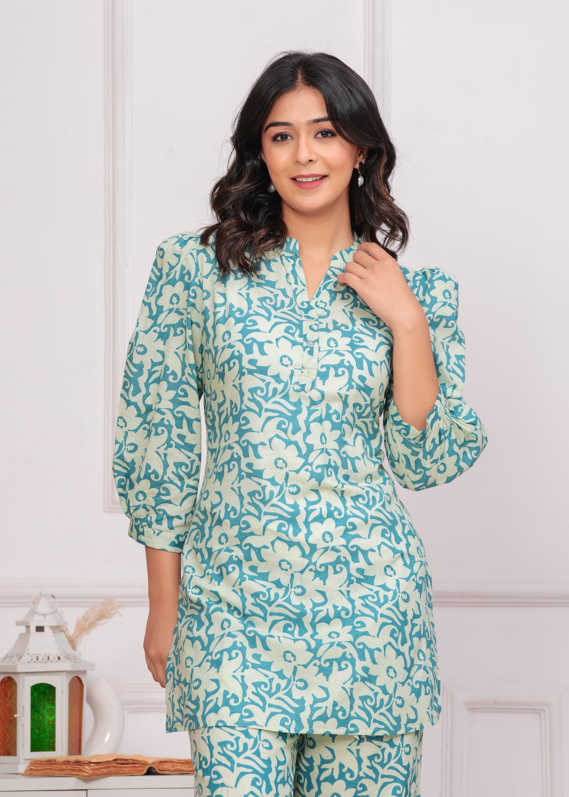 Step into subtle elegance with this pastel sea green floral cotton co-ord set, perfect for casual charm and everyday comfort. Featuring a straight-fit kurta with three-quarter puff sleeves and a soft mandarin collar, the set is adorned with soothing green floral prints on a light base. The matching straight pants complete the coordinated look, offering both ease and style. Ideal for daytime outings, work-from-home wear, or laid-back brunches.