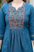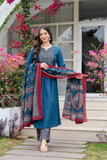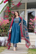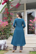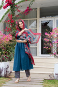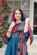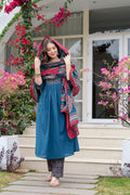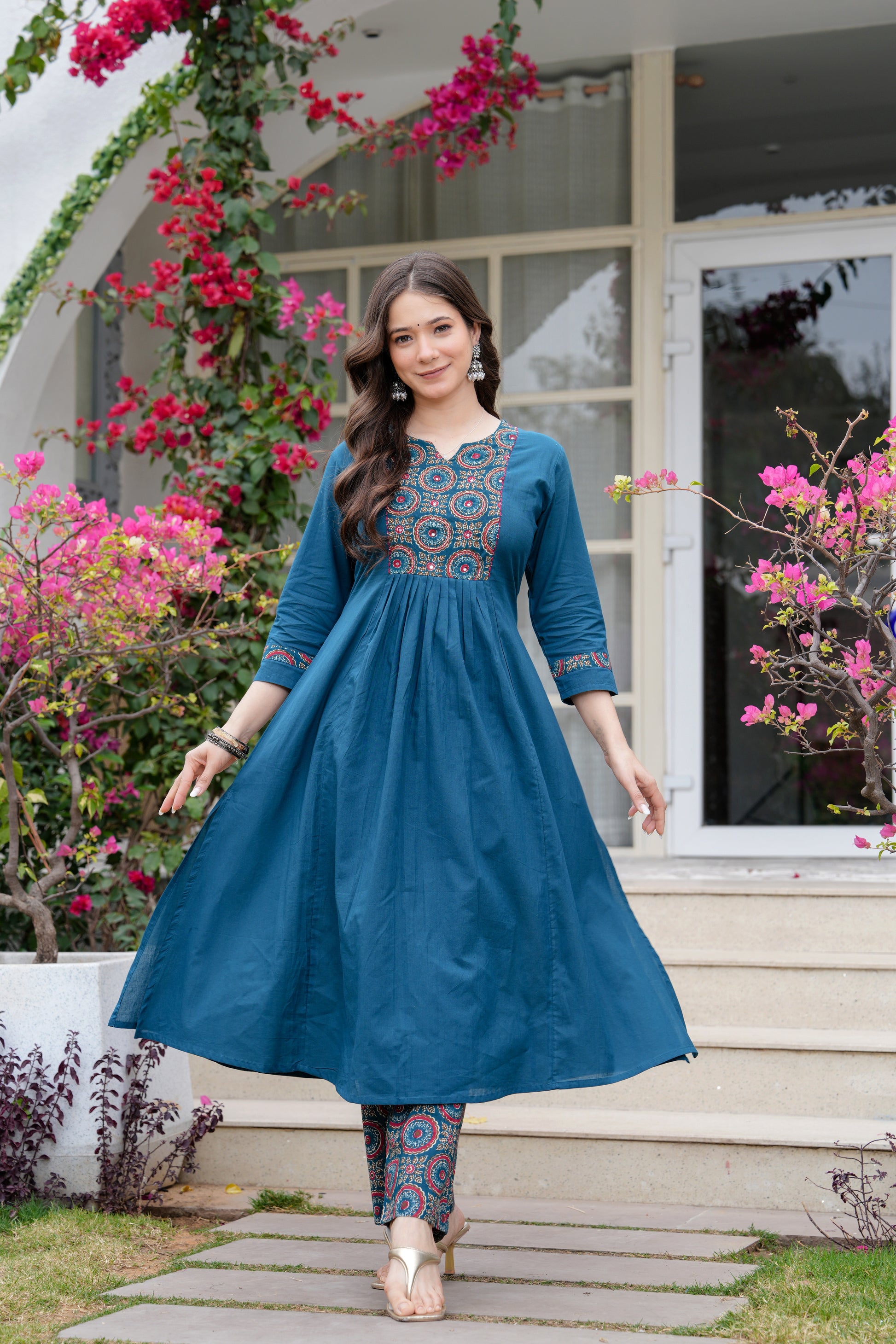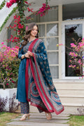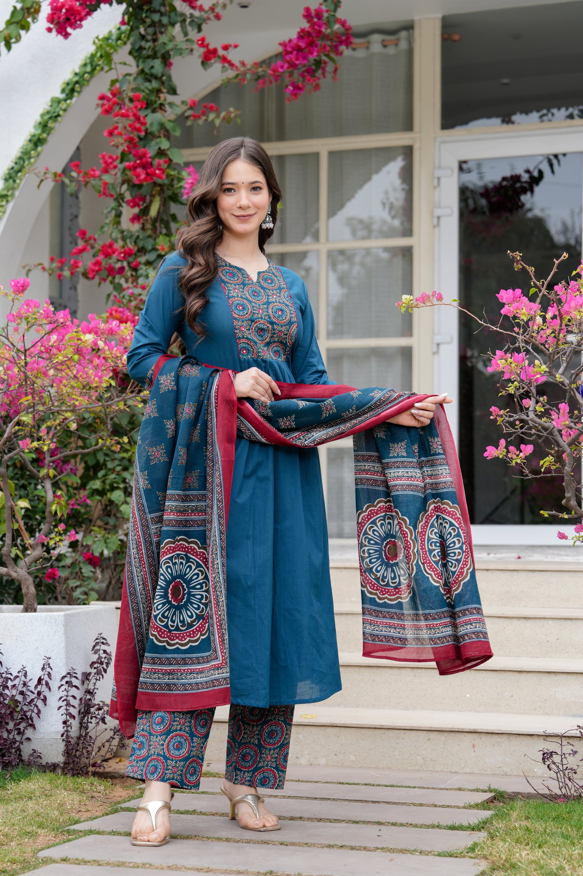 Infuse elegance into your ethnic wardrobe with this rich blue pleated suit set featuring intricate handblock-style prints. The kurta boasts fine pleats below the yoke for a flattering flare, adorned with delicate embroidery around the neckline. It comes paired with a matching printed pant and a beautifully coordinated mulmul dupatta with traditional motifs and a contrasting teal border. A perfect pick for festive get-togethers, poojas, or elegant day outings.