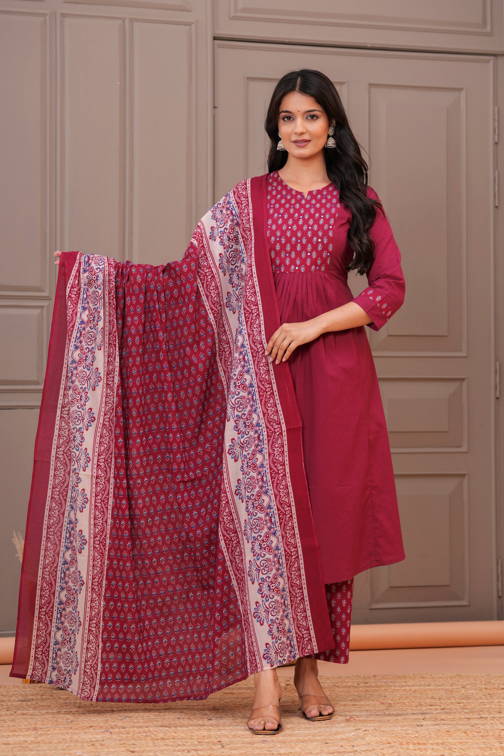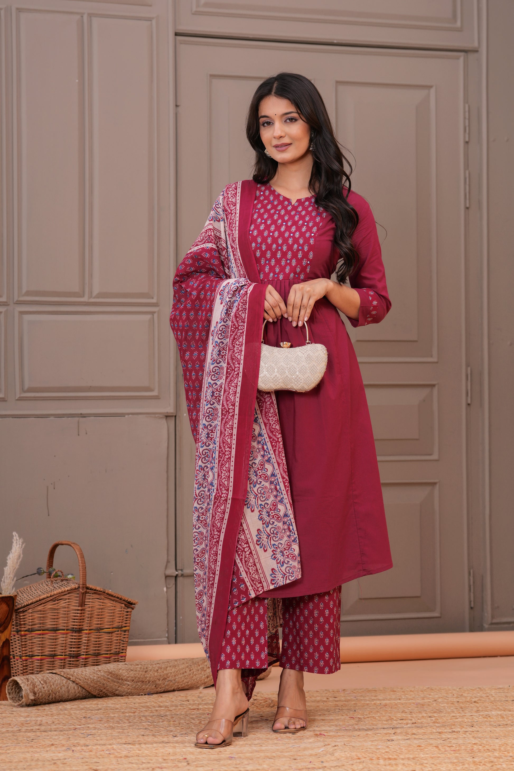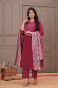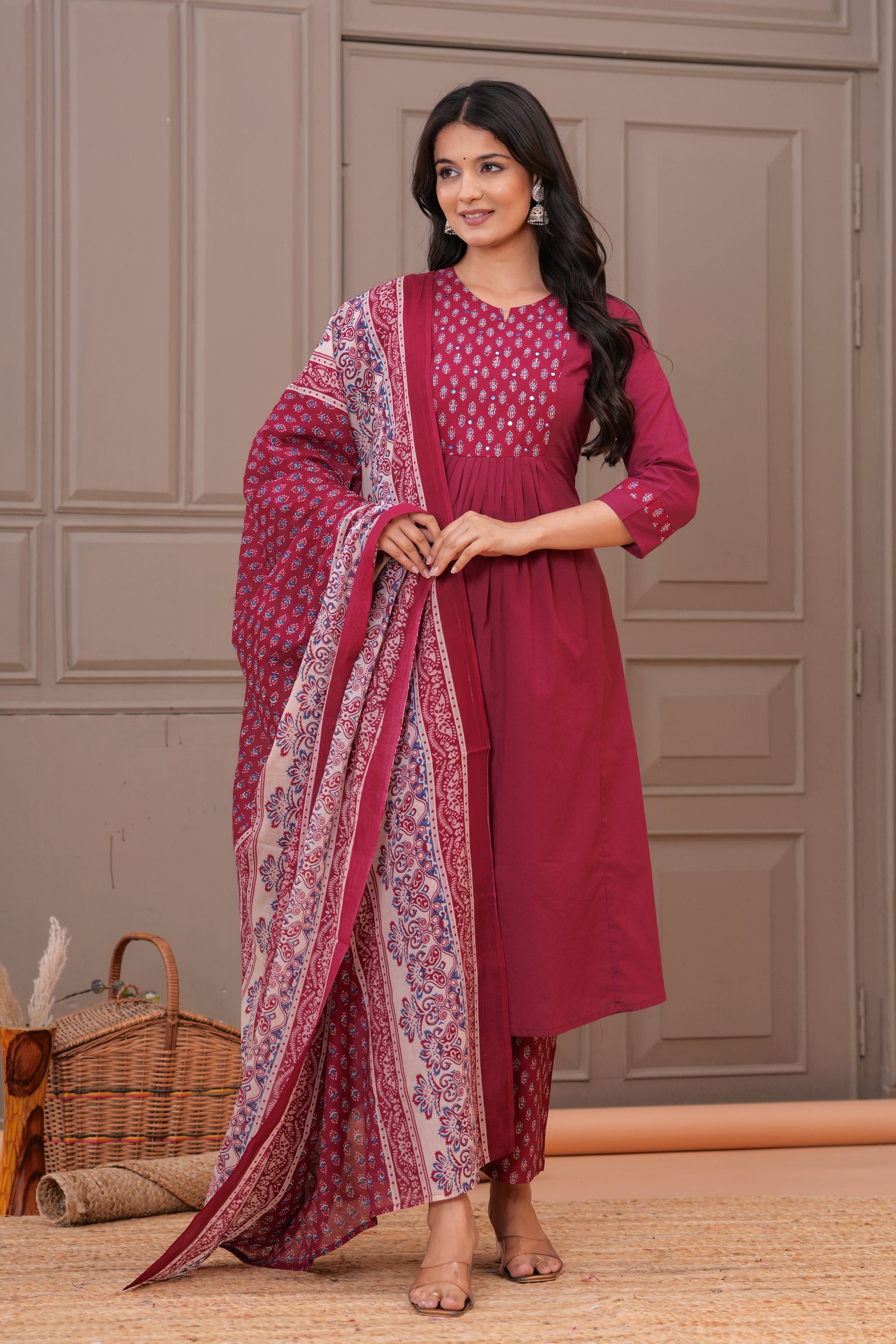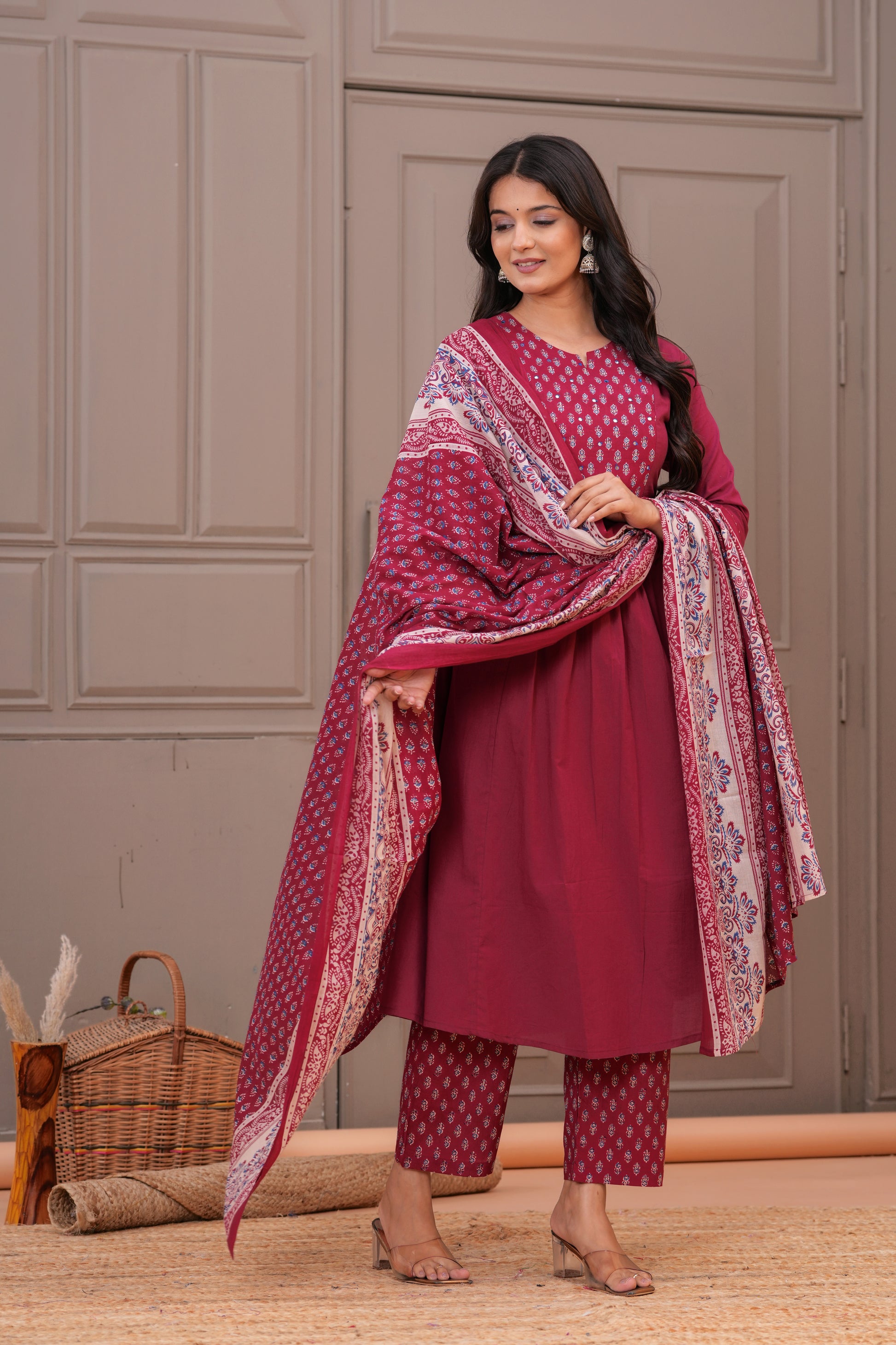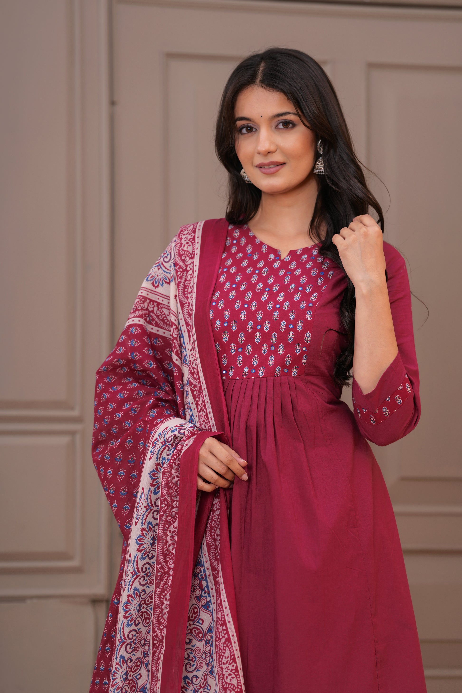 Elevate your ethnic wardrobe with this elegant maroon pleated suit set, perfect for both casual and festive occasions. The kurta features delicate all-over block prints with soft pleats that add a flattering flow to the silhouette. Paired with a matching printed pant and a beautifully coordinated dupatta adorned with intricate floral patterns, this ensemble is a celebration of traditional artistry and modern comfort. Made from breathable cotton fabric, it ensures ease of wear throughout the day. Style it with silver jhumkas and juttis for a timeless ethnic look.