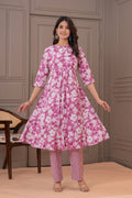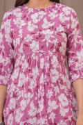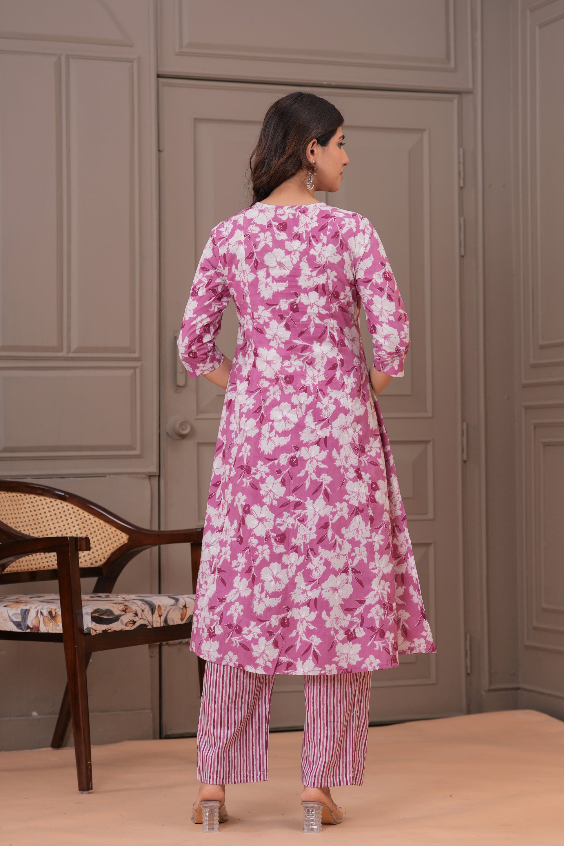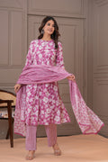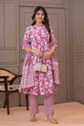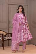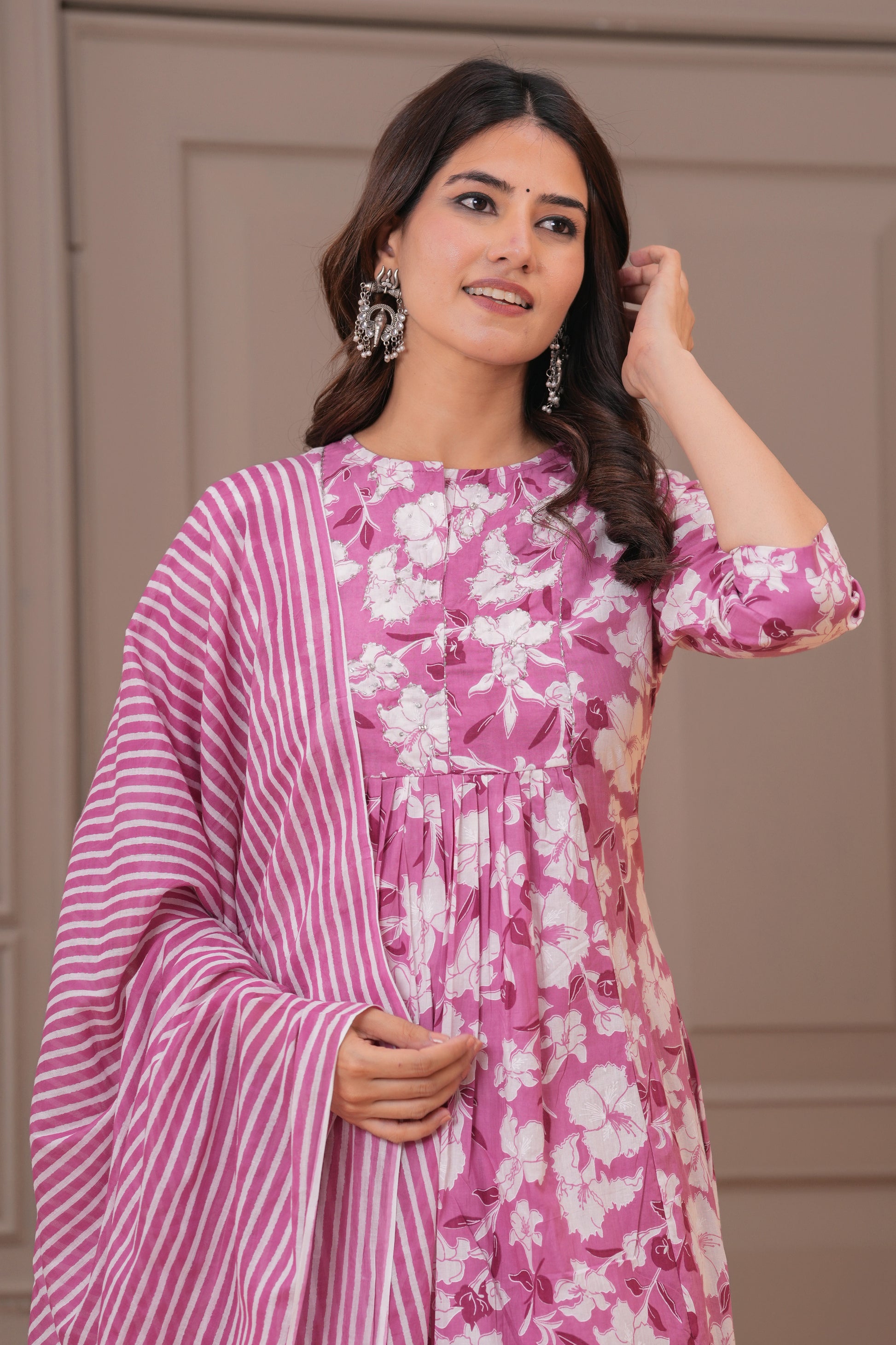 Brighten up your ethnic wardrobe with this elegant onion pink pleated suit set, designed to add grace and charm to your daywear. Crafted from soft cotton, this set offers a refreshing combination of floral patterns and traditional prints. This suit set features kurta with a classic round neckline and 3/4th sleeves, with onion pink base. Pants: Tapered pants with delicate white motifs, adding a subtle contrast and completing the ensemble with style. Dupatta: Light and airy cotton mulmul dupatta with alternating stripes and floral motifs in matching tones, giving the set a cohesive and elegant finish. Perfect for casual outings, brunches, or festive day events, this suit set blends comfort with timeless ethnic beauty.