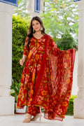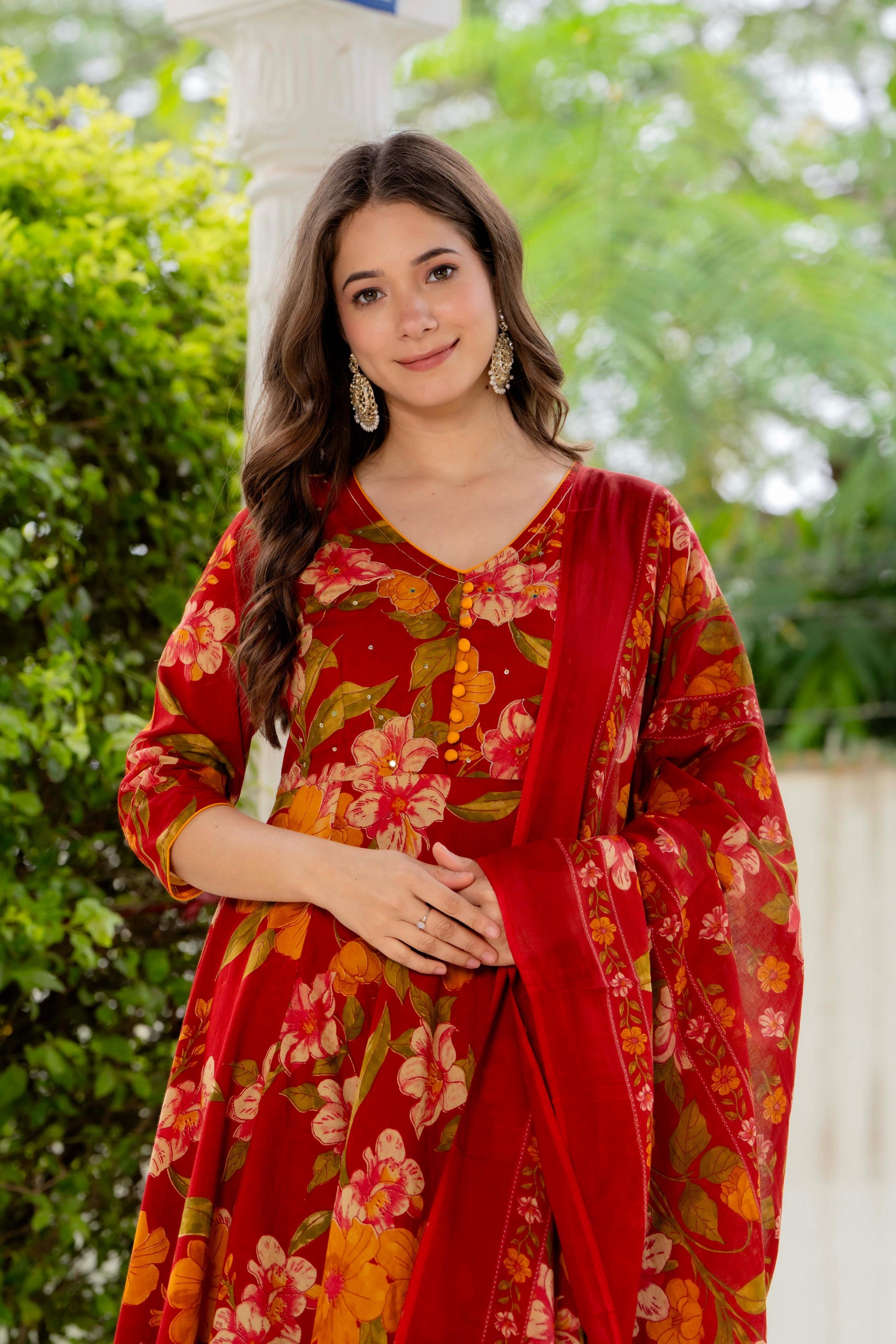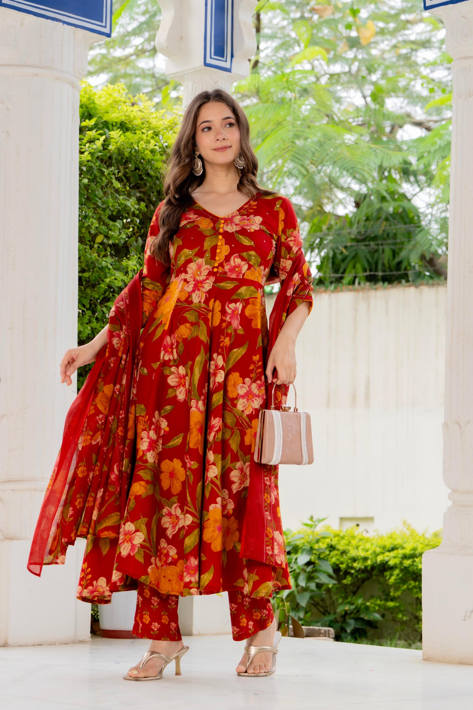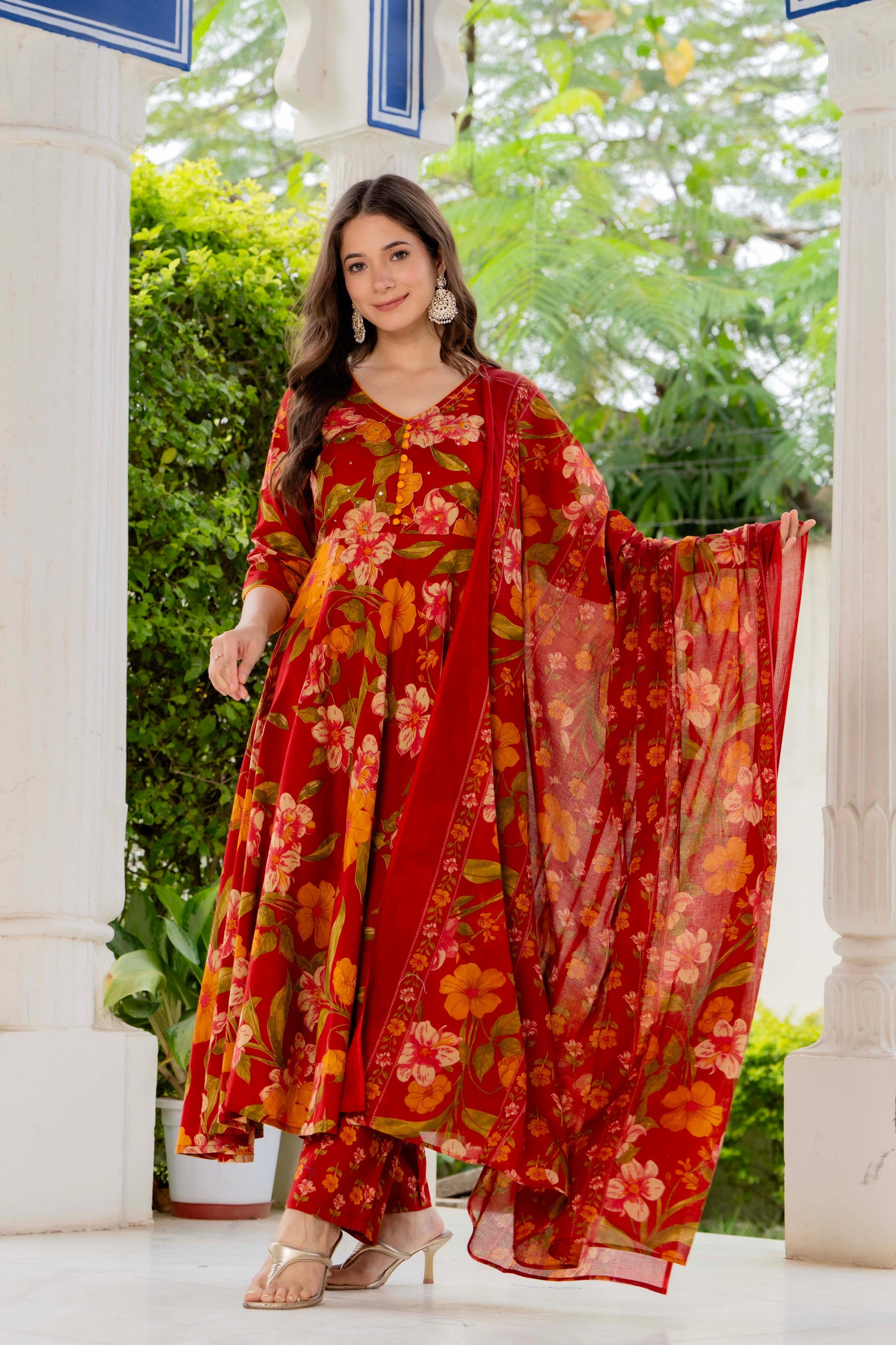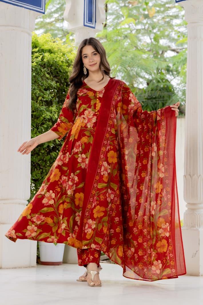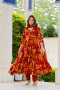 Experience timeless elegance with our Sunset Bloom Anarkali Suit Set, crafted in a rich Rust red palette adorned with vibrant floral prints. A beautifully flared silhouette with a flattering scoop neckline and intricate floral patterns that bring a fresh, feminine charm with Comfortable straight-fit pants. A soft, flowy dupatta.