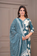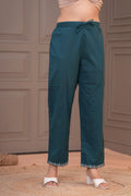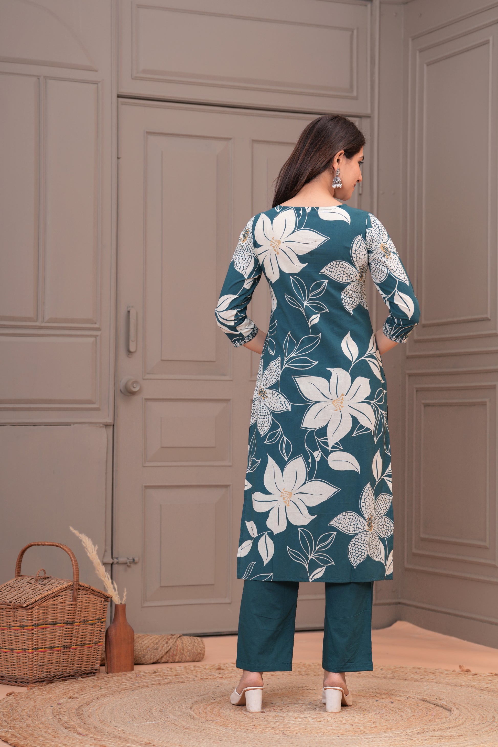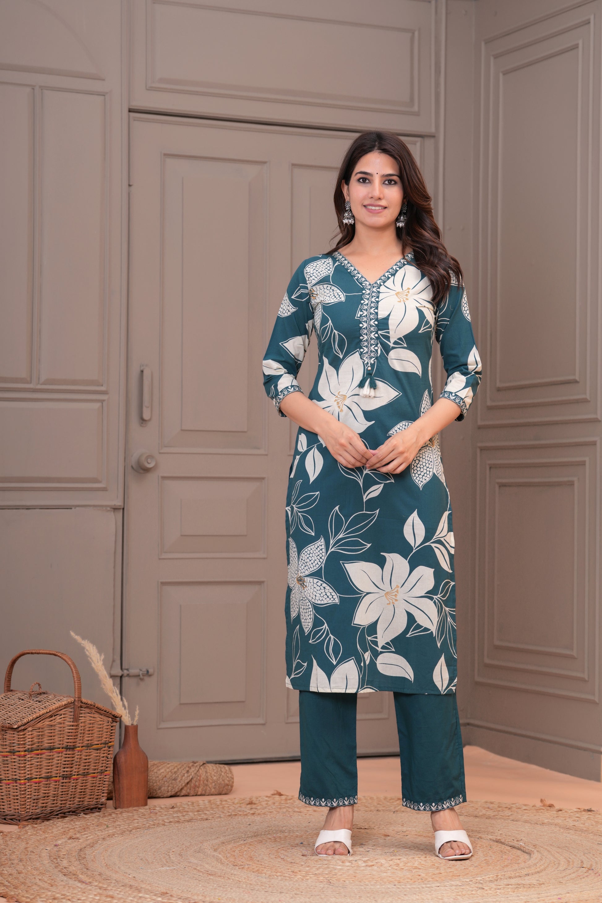 Elevate your everyday ethnic style with this beautifully crafted teal blue suit set. Featuring an eye-catching floral print and intricate detailing, this outfit is a perfect balance of comfort, tradition, and elegance — ideal for daywear, small festive occasions, or semi-formal outings. Kurta: Straight-fit kurta with a flattering V-neckline, adorned with embroidery work and tassel detailing. The rich teal base is enhanced with large floral motifs in off-white and beige, giving it a bold yet graceful look. Finished with 3/4th sleeves and printed trims on the cuffs. Pants: Solid teal straight pants with printed scallop detailing at the hem, matching seamlessly with the kurta for a polished ethnic look. Dupatta: Lightweight printed dupatta featuring geometric and floral borders, tying the ensemble together with sophistication and flow. Perfect for daytime events, office wear with ethnic flair, or casual festive looks—pair it with oxidized jewelry and sandals to complete the ensemble.