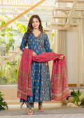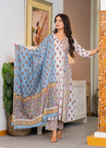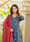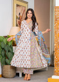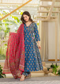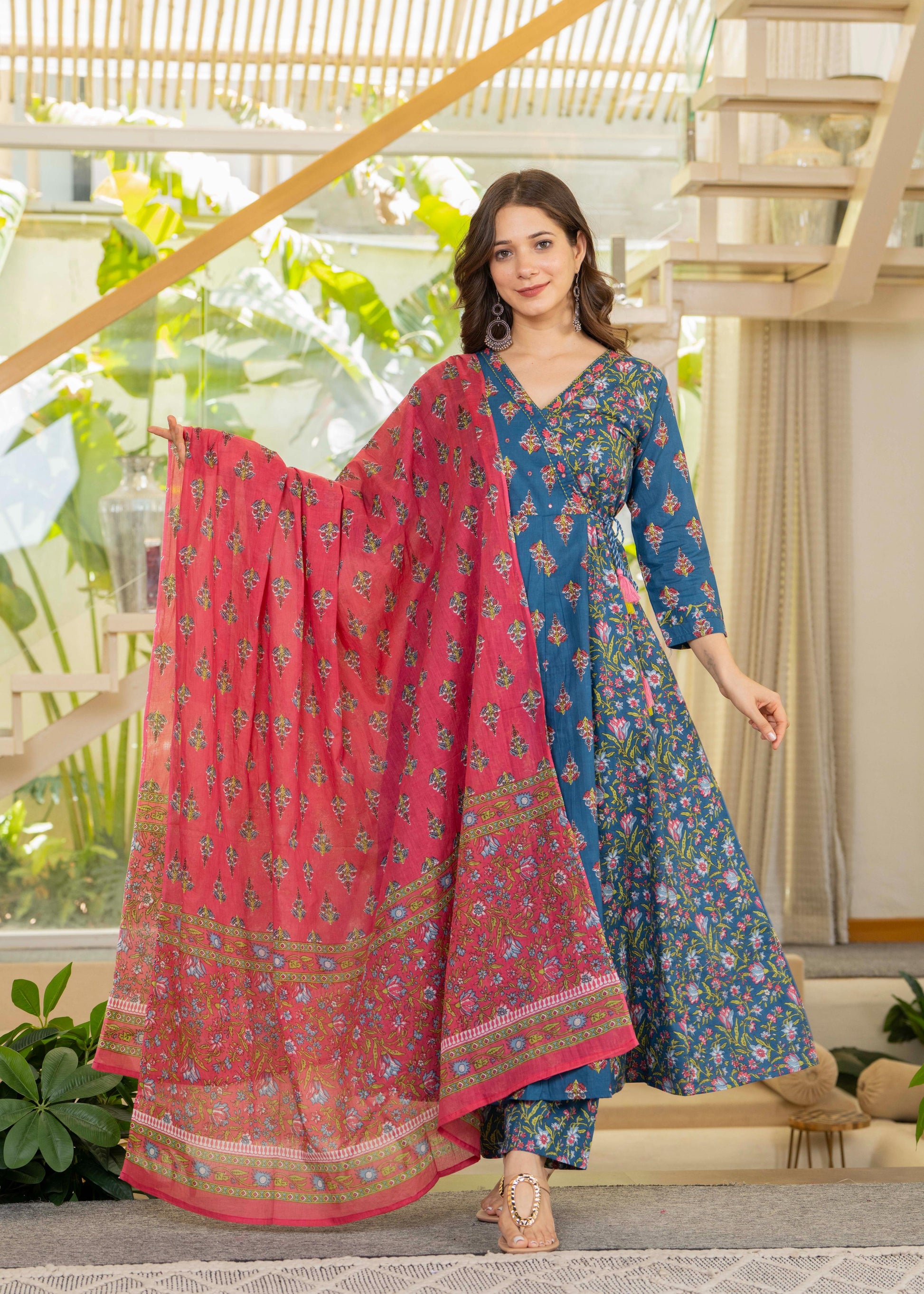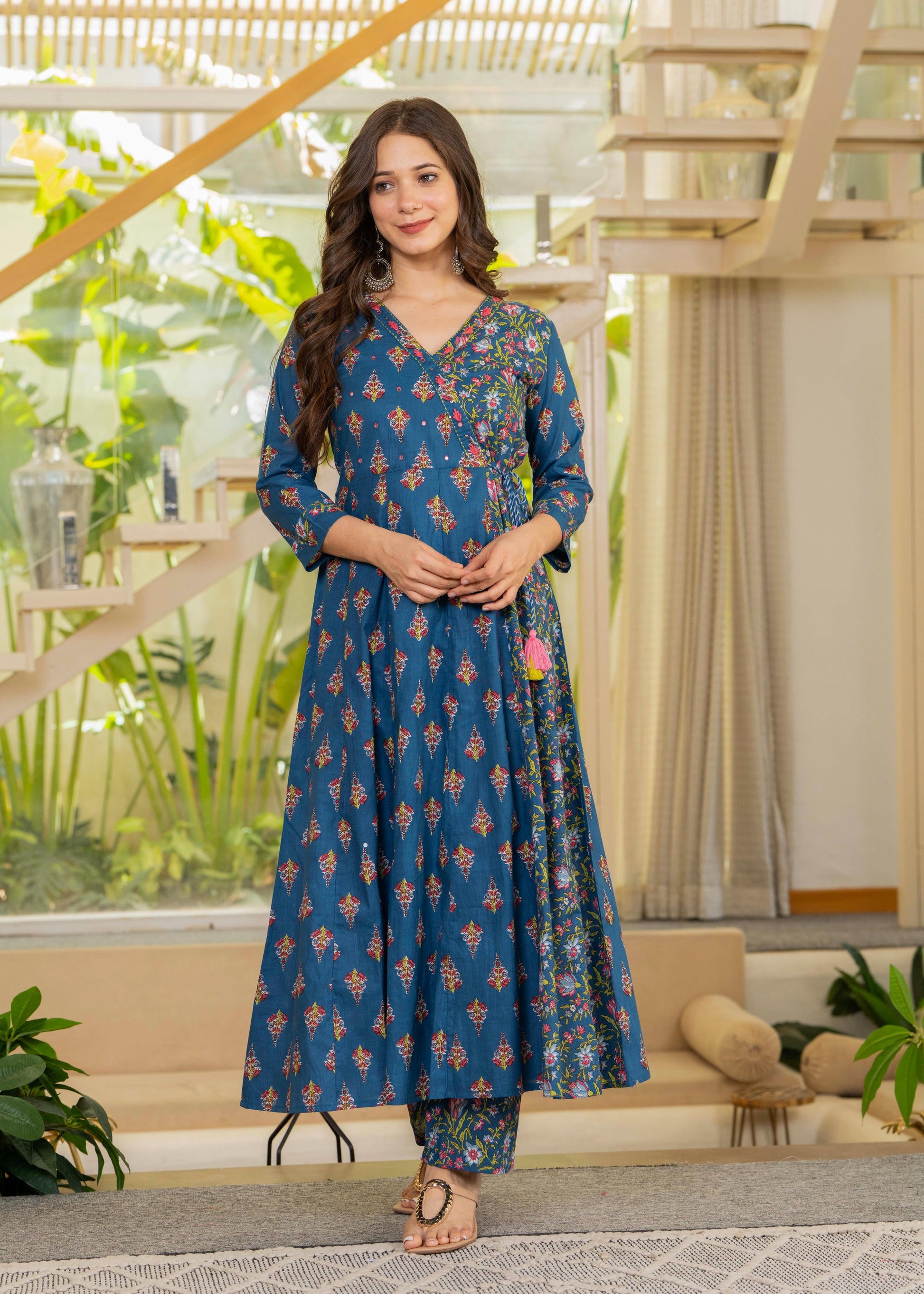 Grace that twirls with every step – our white blue angrakha Anarkali Set is a celebration of timeless charm and vibrant prints. Crafted in soft cotton with a flowy silhouette, it features a mix of floral motifs and traditional buti prints, paired beautifully with a contrasting dupatta. Perfect for festive mornings, family get-togethers, or a breezy ethnic day out.