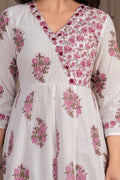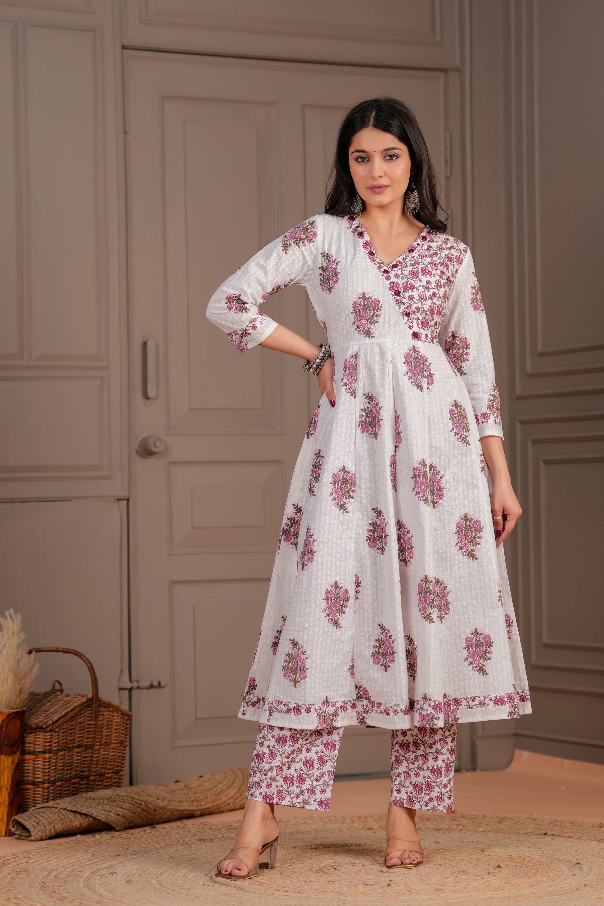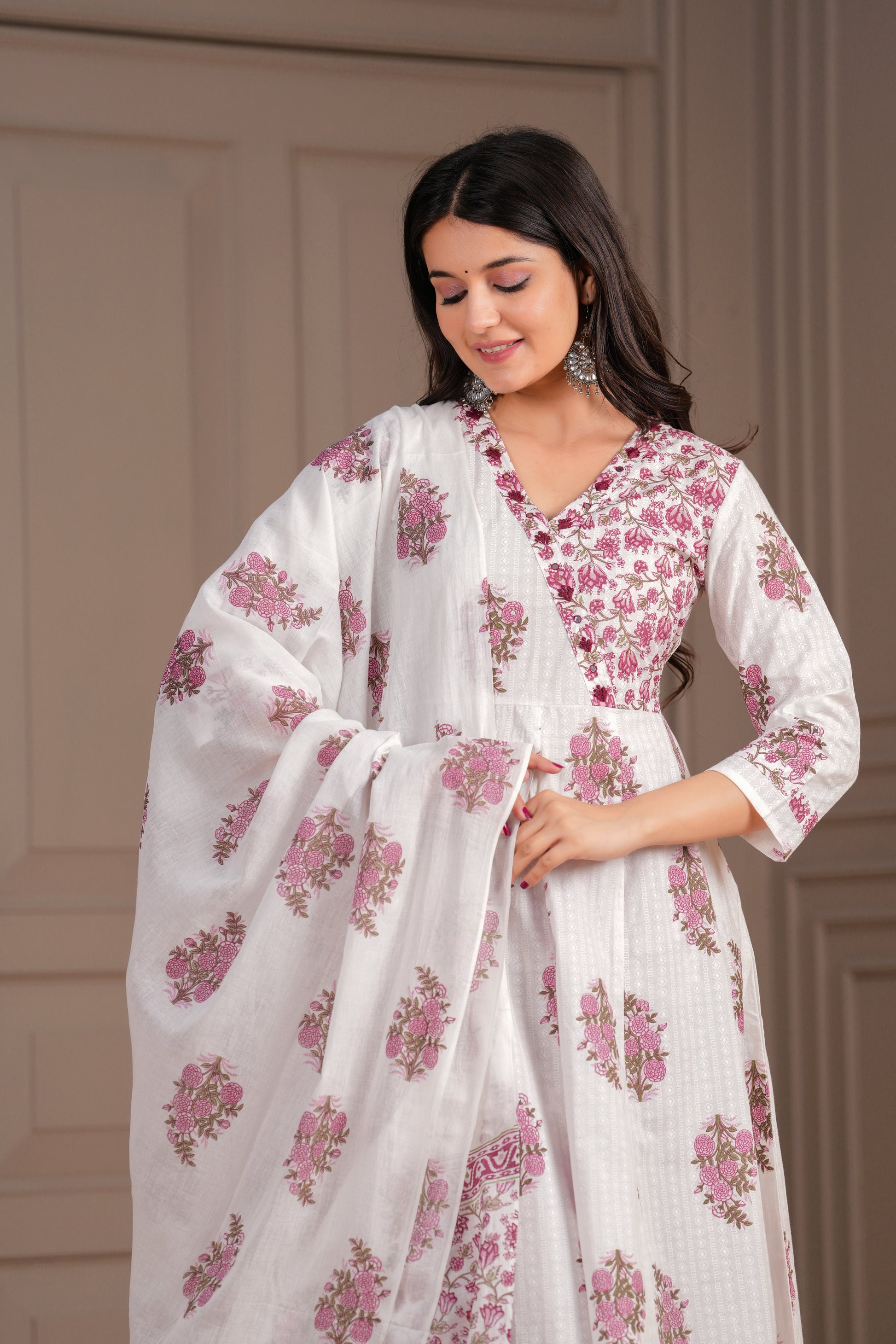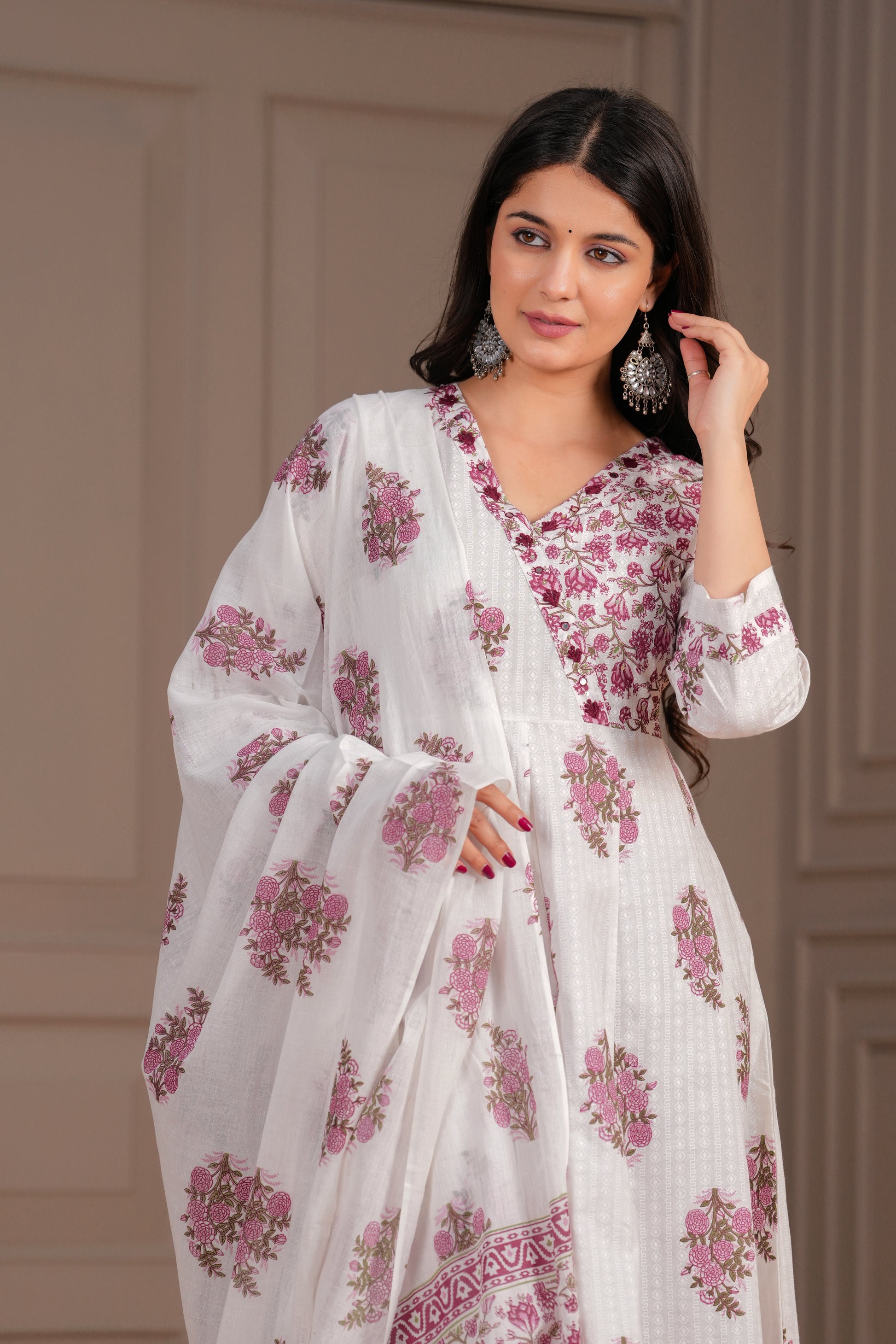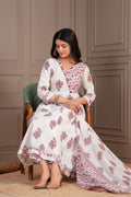 Elevate your ethnic charm with this graceful white Anarkali suit set, intricately adorned with pink handblock floral motifs. The kurta features a flared silhouette with a structured yoke, V-neckline, and 3/4th sleeves, bringing together style and comfort. Paired with straight-fit pants and a beautifully coordinated cotton dupatta, this set is a perfect choice for daytime functions, festive gatherings, or casual elegance.