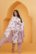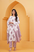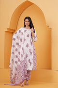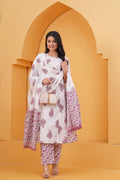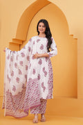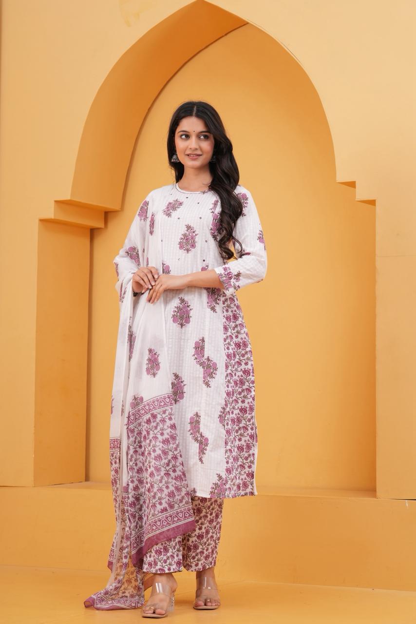 Elevate your ethnic charm with this graceful white straight suit set, intricately adorned with pink handblock floral motifs. The kurta features a straighth silhouette with round-neckline, and 3/4th sleeves, bringing together style and comfort. Paired with straight-fit pants and a beautifully coordinated cotton dupatta, this set is a perfect choice for daytime functions, or casual elegance.
