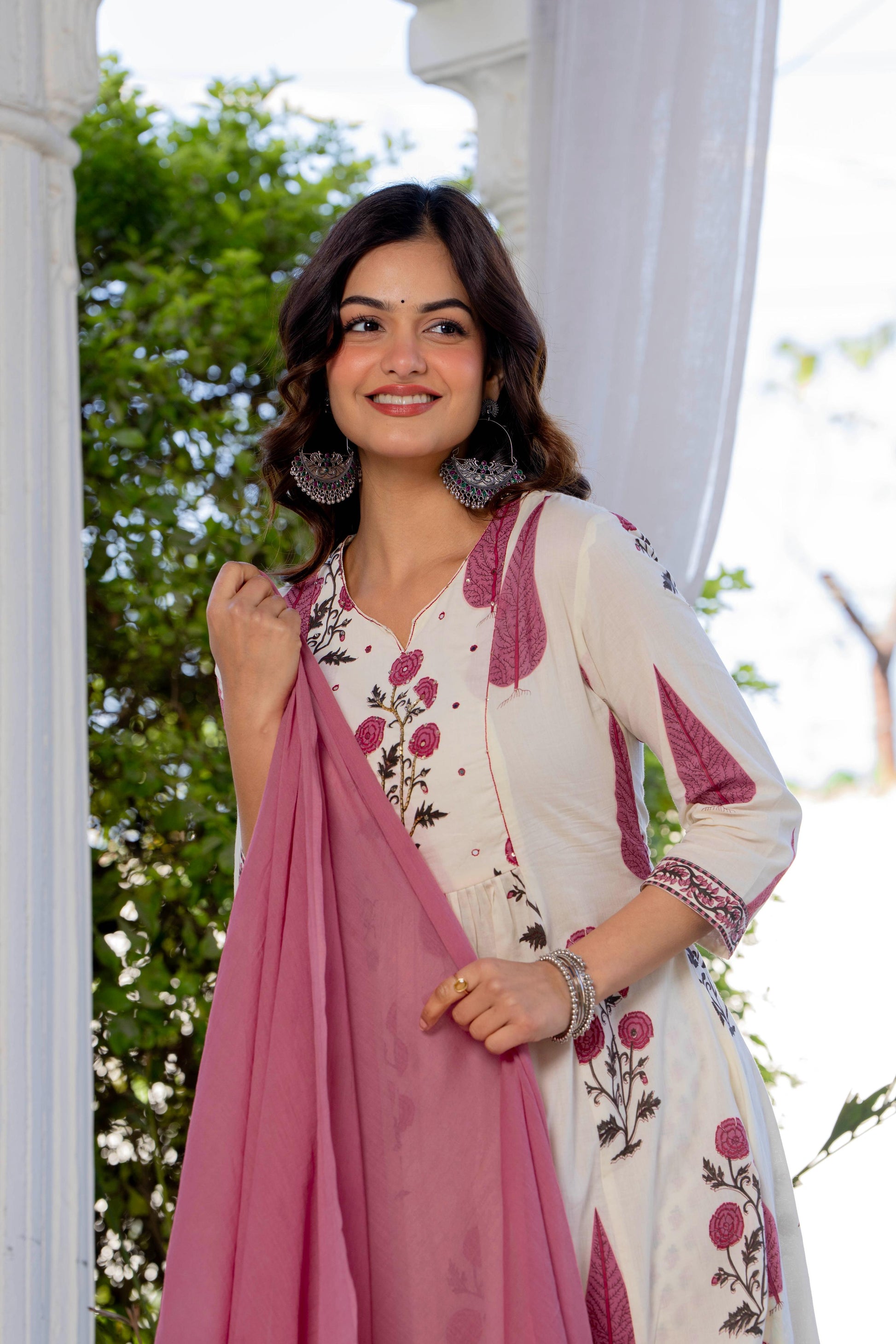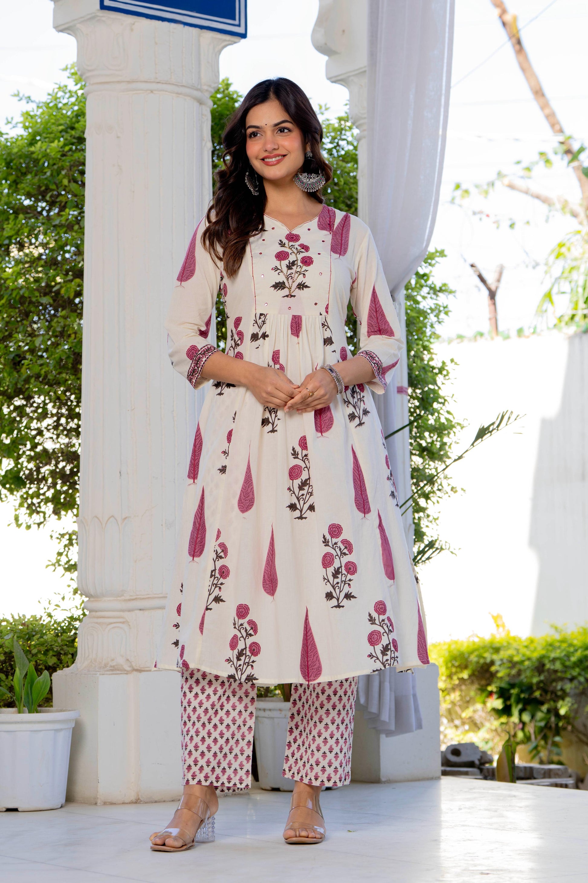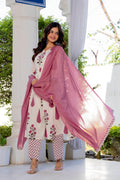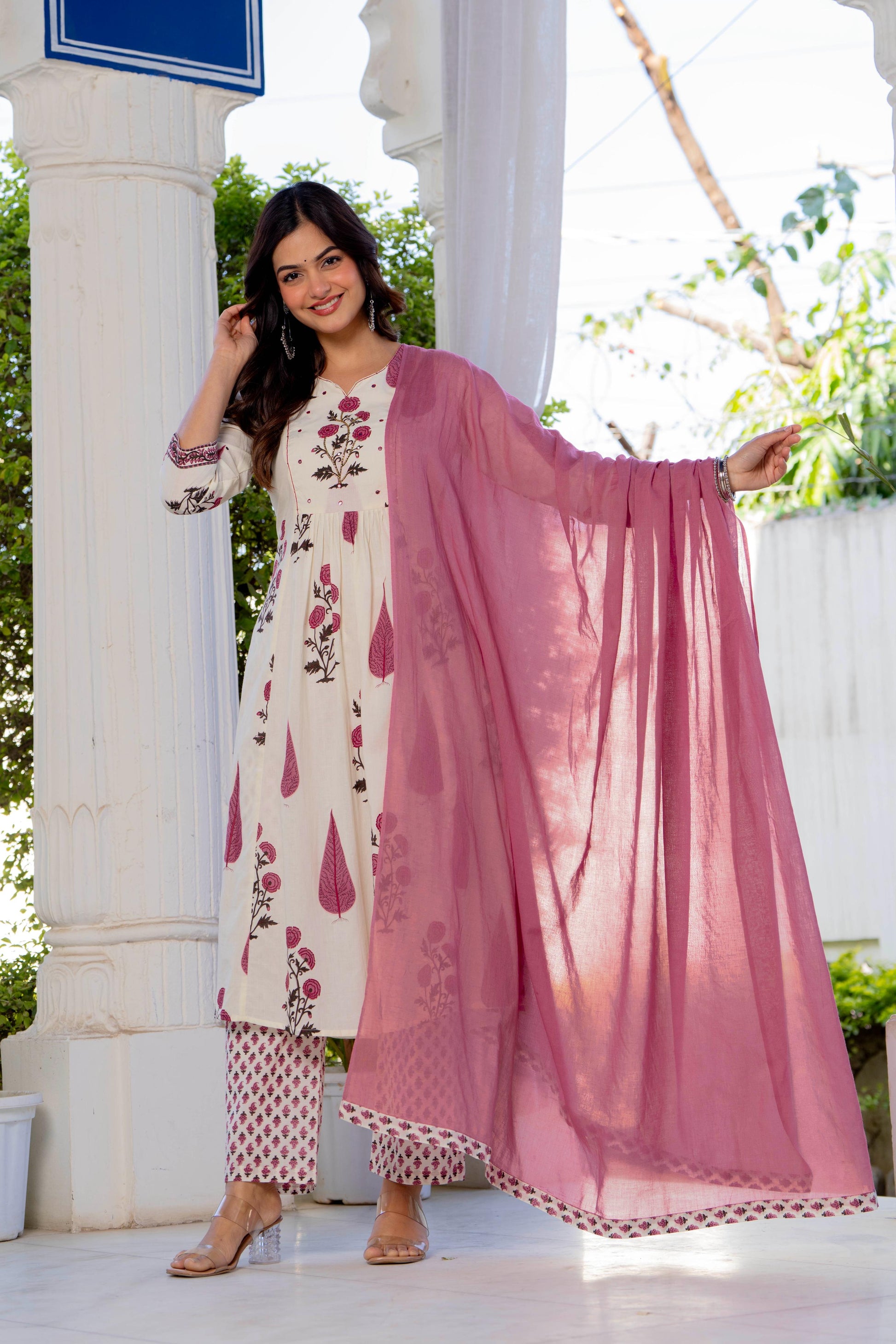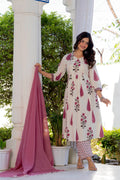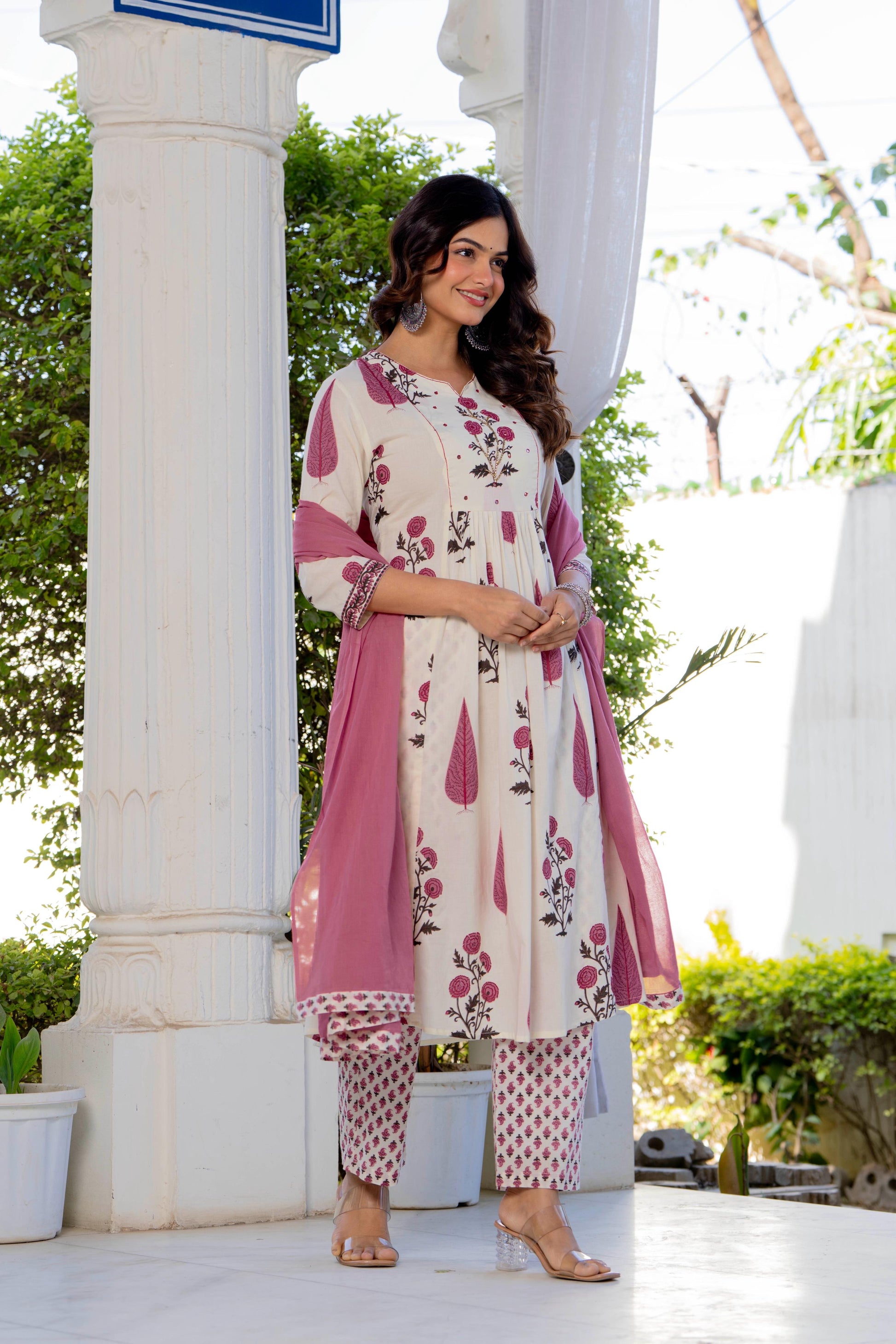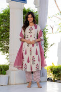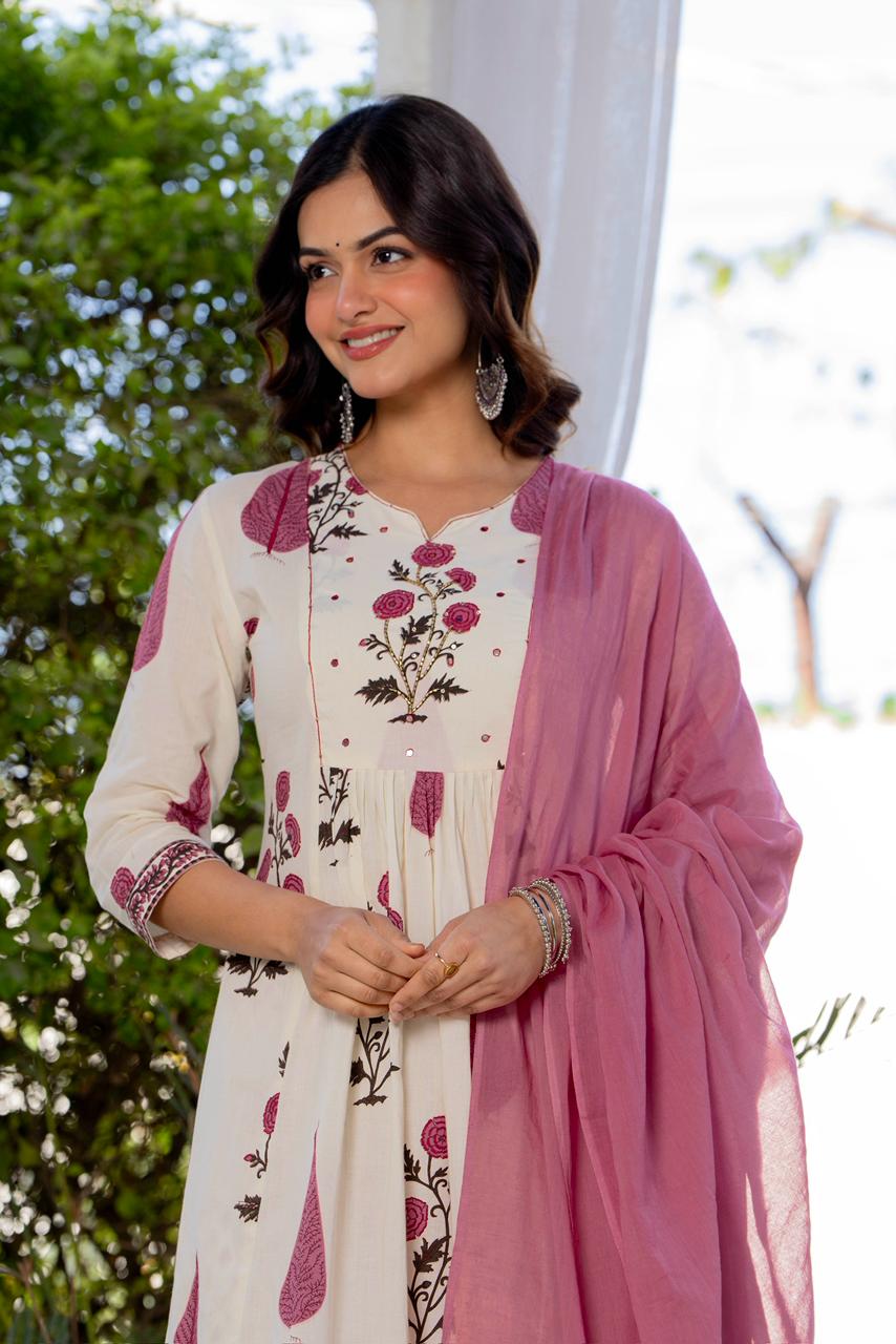 An effortless blend of grace and comfort, this pleated suit set is crafted in a soothing ivory base adorned with delicate rose and leaf motifs in dusty pink and earthy tones. The kurta features gentle front pleats that add fluid movement and a flattering fall, while the intricately printed yoke and sleeves bring a touch of artisanal charm. Paired with coordinated printed straight pants and a graceful solid pink dupatta, this set is perfect for daytime festivities, intimate gatherings, or elegant everyday wear. Light, breathable, and timeless—this ensemble celebrates understated beauty with every detail.