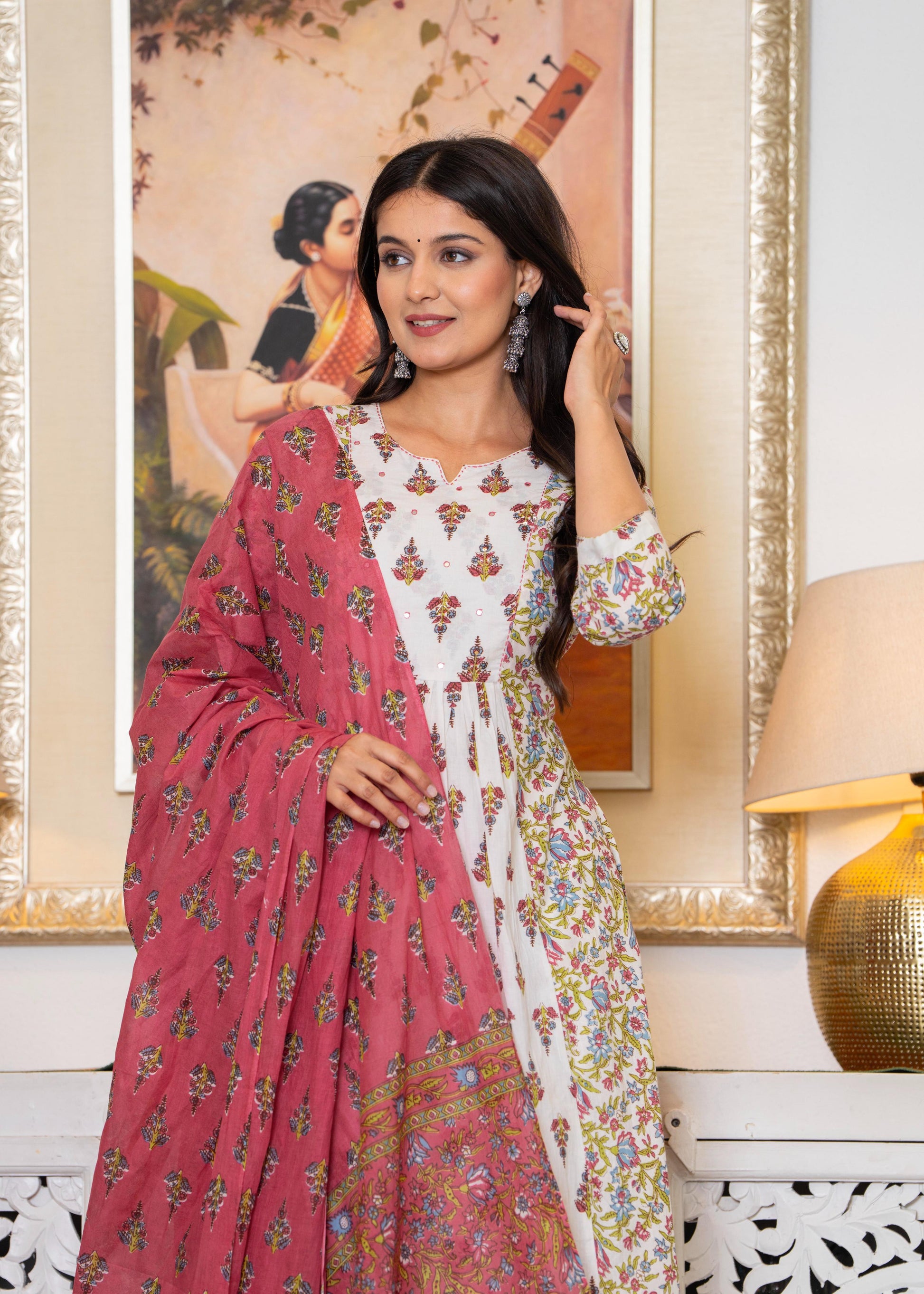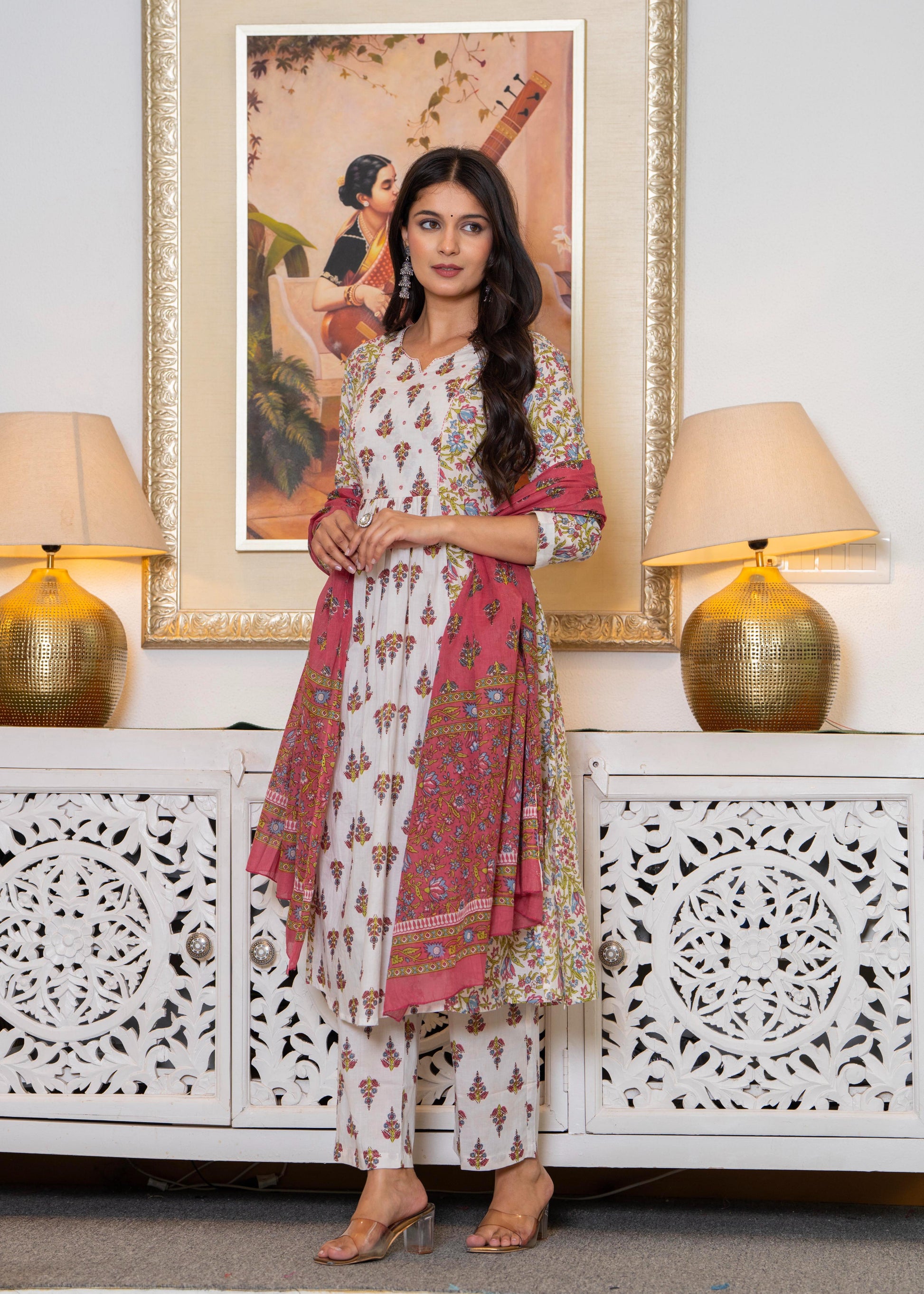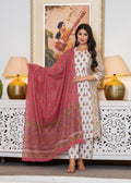 Step into effortless elegance with our white pink floral pleated suit set. Featuring a flowy pleated kurta adorned with vibrant floral prints, paired with printed pants and a beautifully printed dupatta — this look is a breath of fresh air. Perfect for casual gatherings, festive brunches, or a touch of everyday charm.