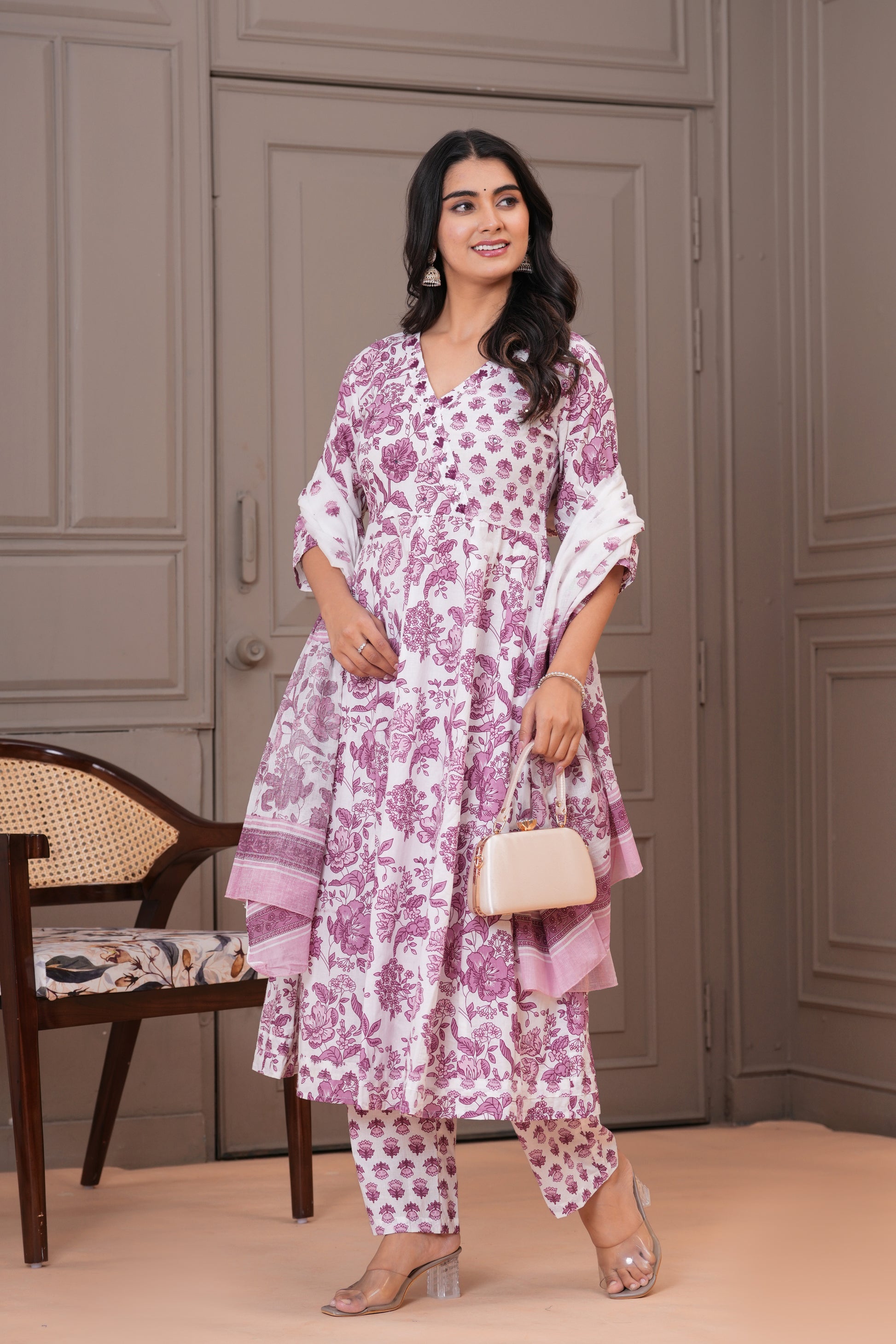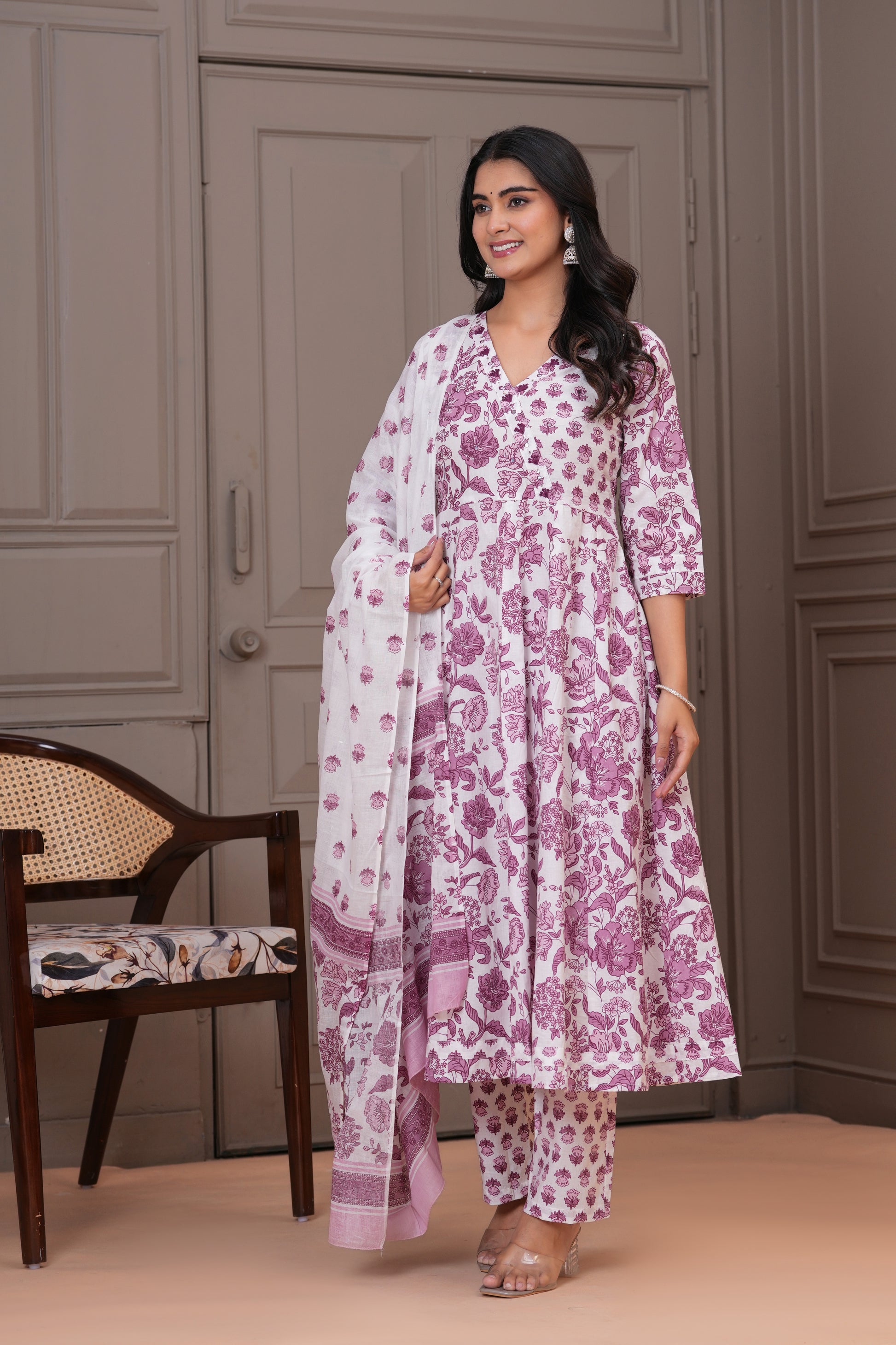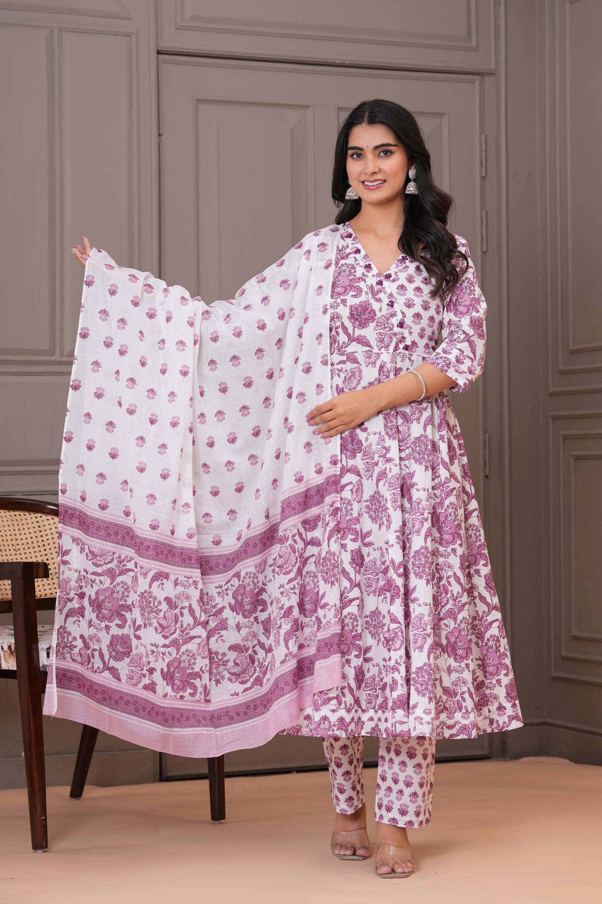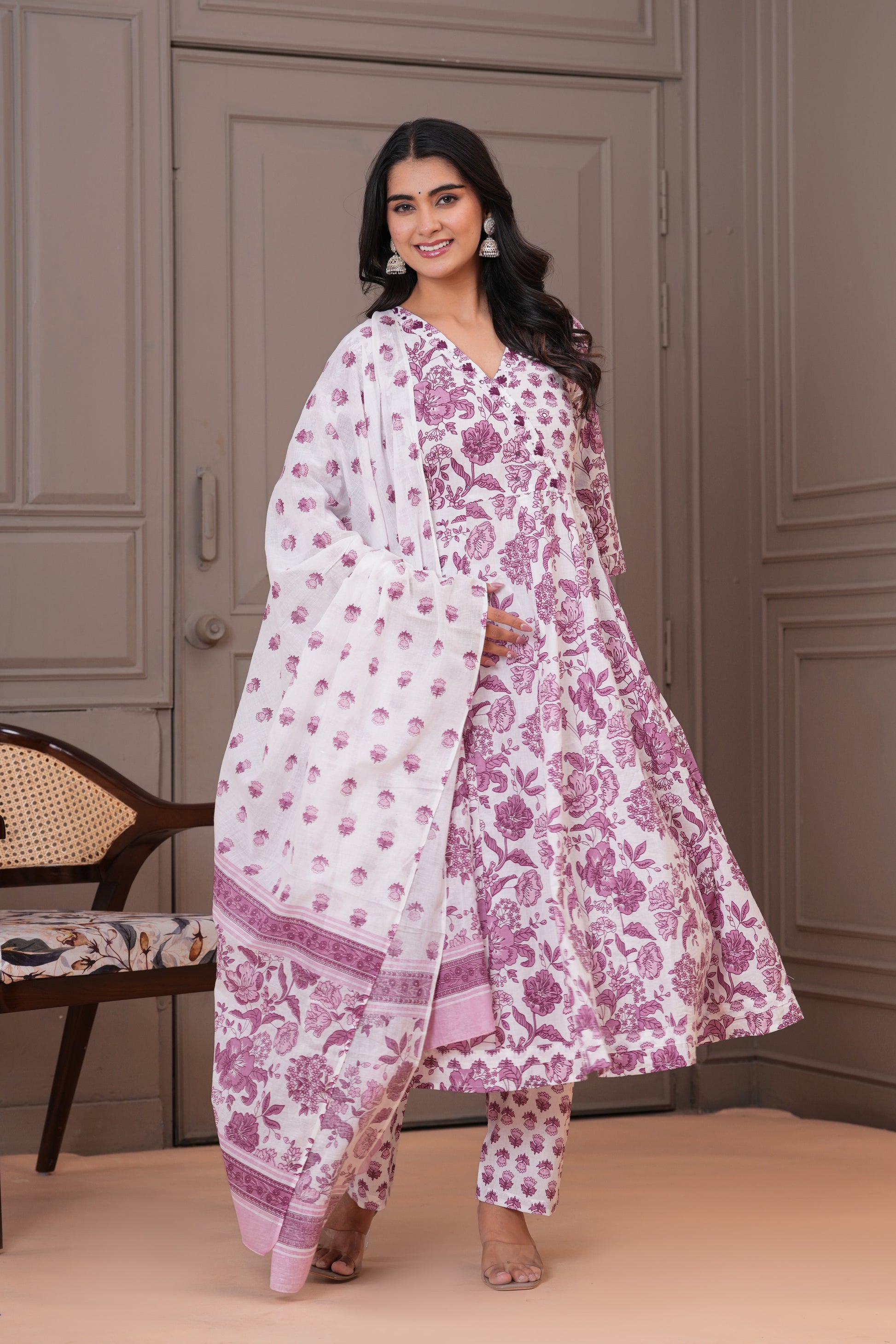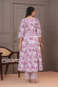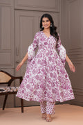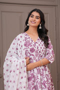 Grace meets comfort in this soothing white purple Anarkali suit set, adorned with traditional handblock floral prints. Crafted from soft and breathable cotton fabric, the flowy Anarkali kurta features a flattering V-neckline and 3/4th sleeves, complemented by straight-fit pants with a delicate buti print. The lightweight cotton dupatta with matching floral patterns completes the look, making it perfect for everyday elegance, casual gatherings, or daytime festivities