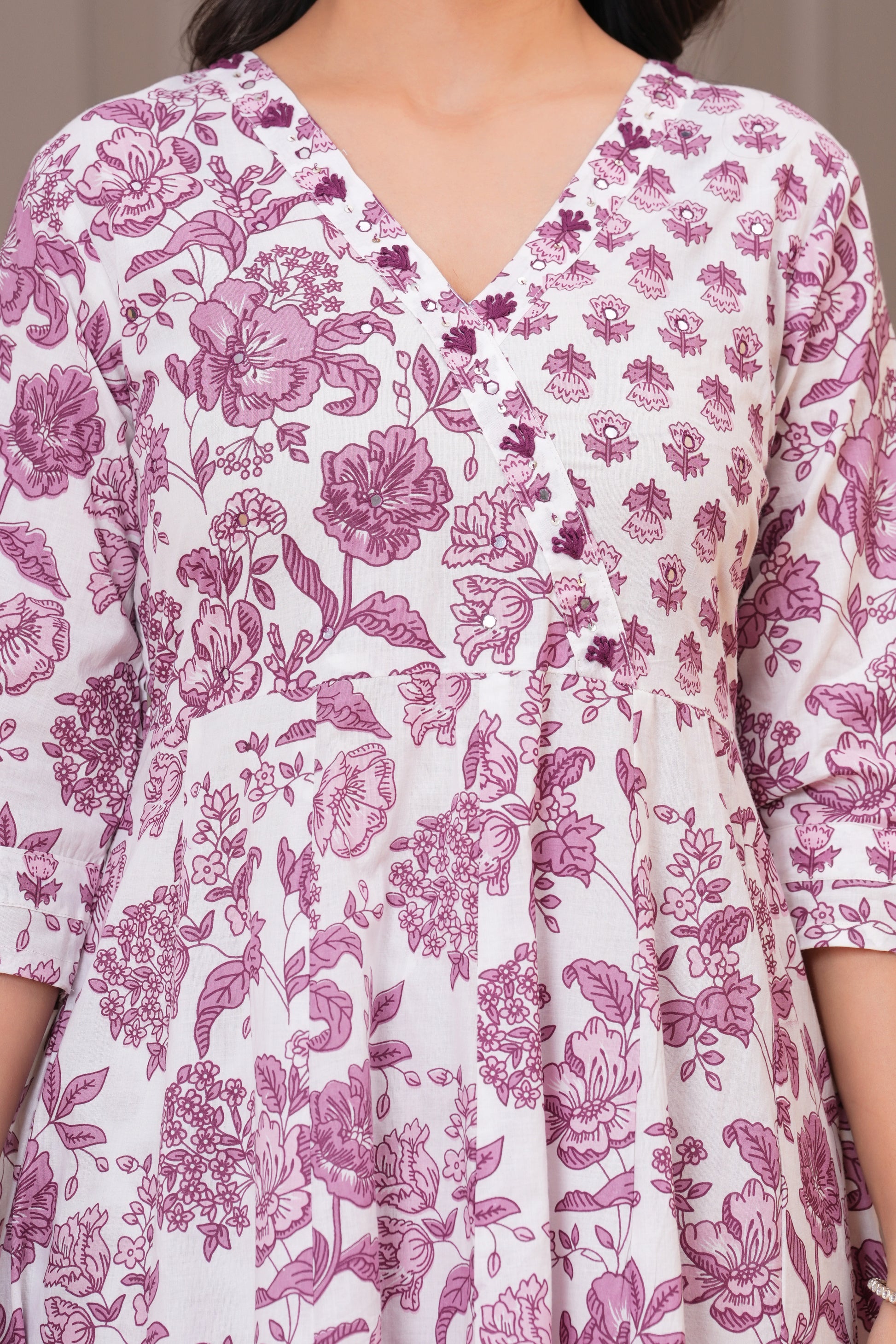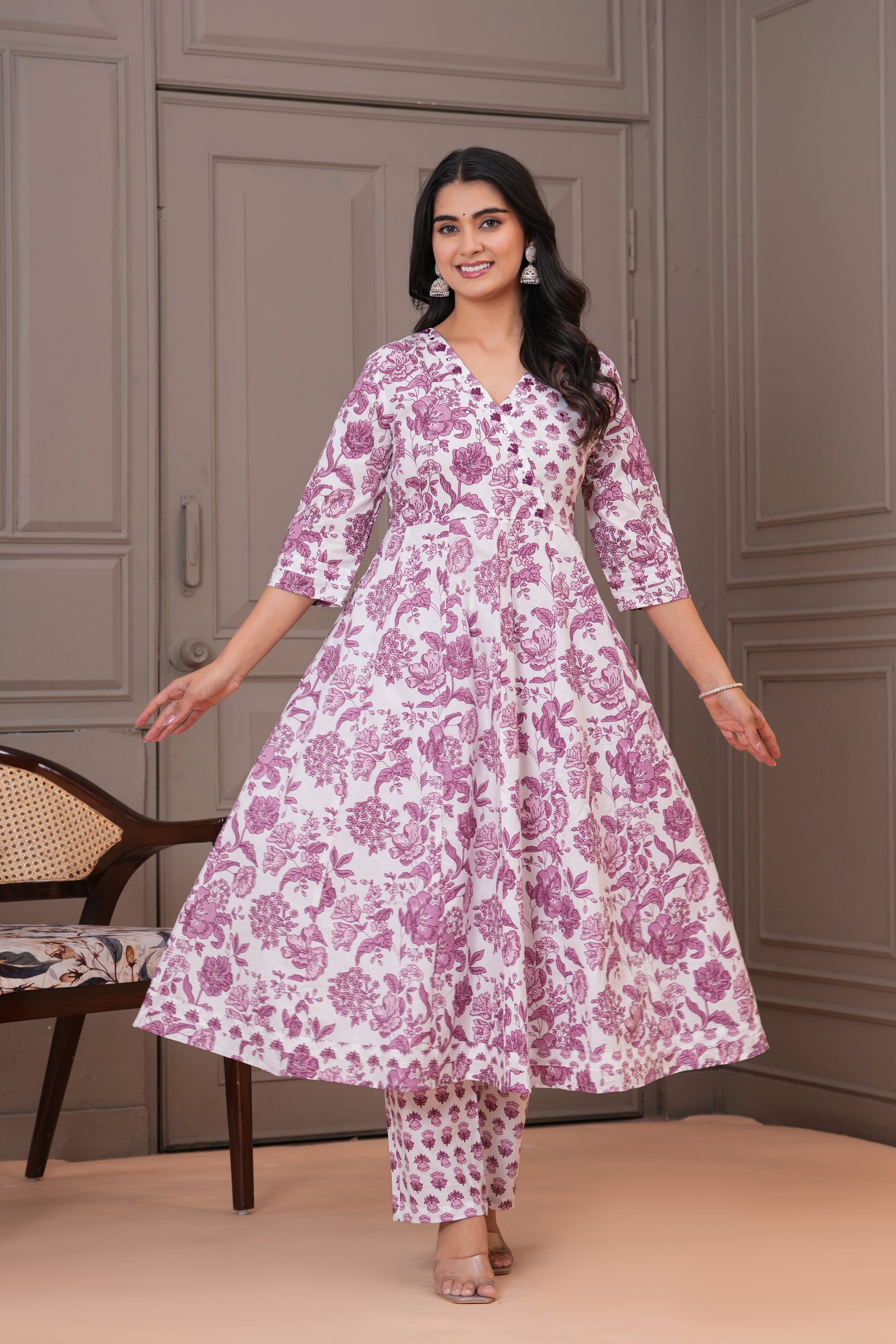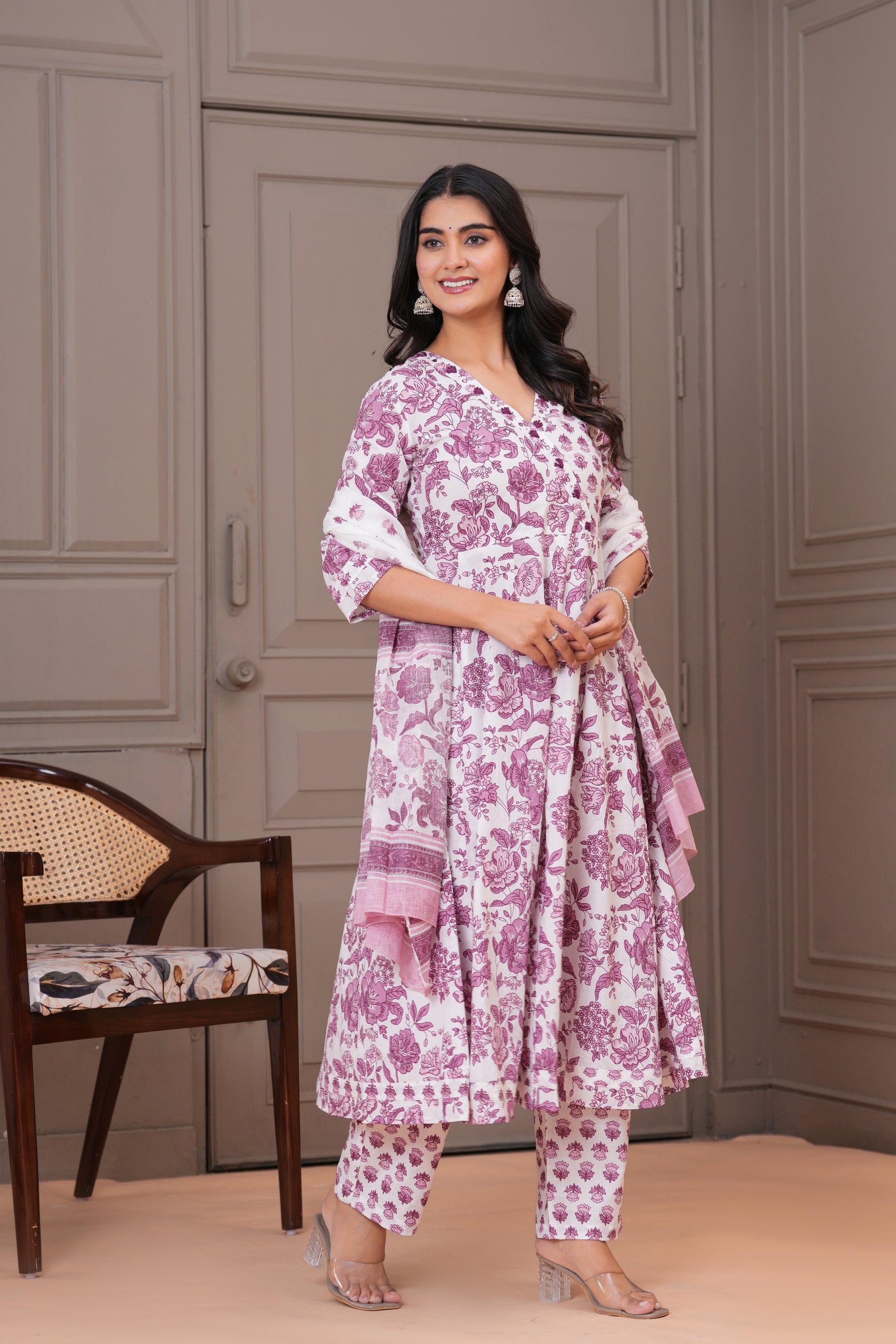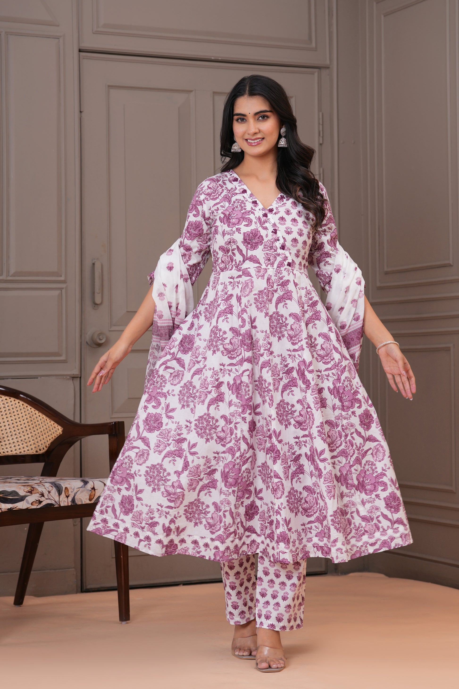 Grace meets comfort in this soothing white purple Anarkali suit set, adorned with traditional handblock floral prints. Crafted from soft and breathable cotton fabric, the flowy Anarkali kurta features a flattering V-neckline and 3/4th sleeves, complemented by straight-fit pants with a delicate buti print. The lightweight cotton dupatta with matching floral patterns completes the look, making it perfect for everyday elegance, casual gatherings, or daytime festivities